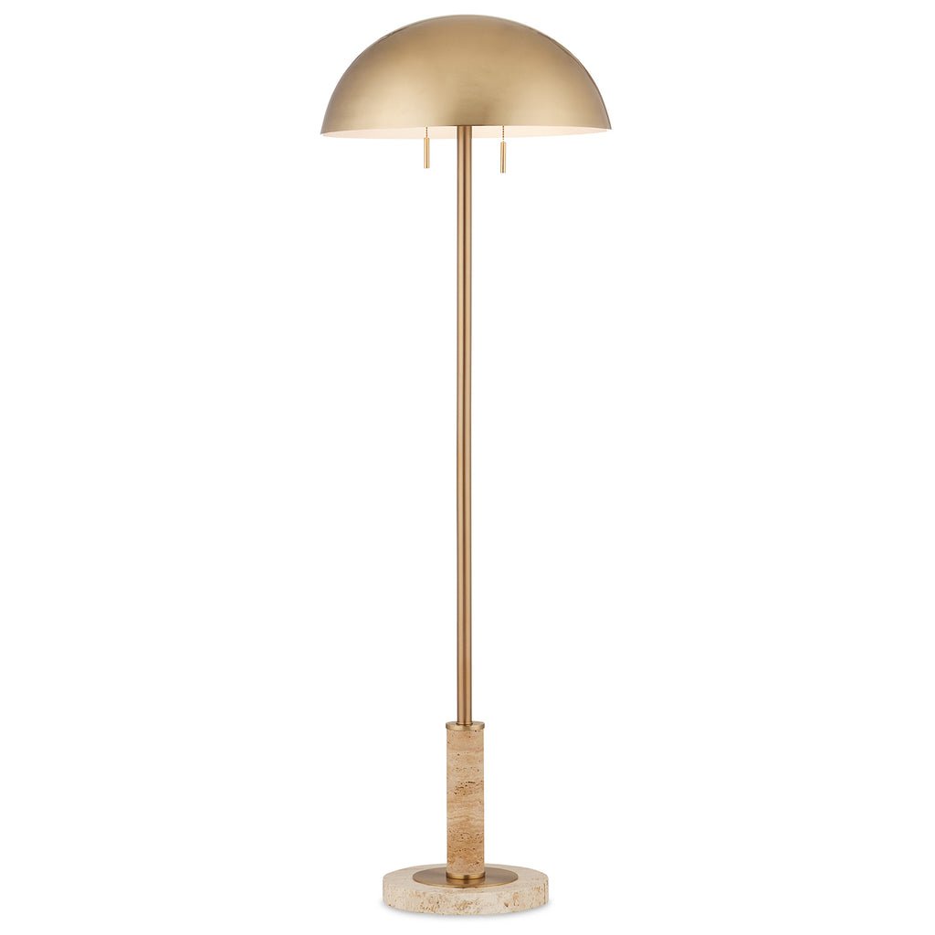 Aimee Kurzner designed the Currey & Co Miles Floor Lamp; the travertine lamp inspired by other pieces with the same name. The mid-century modern vibe is enhanced by the simple shapes of the lamp's base and body, and the domed brass shade that caps it. Because this beige lamp is made of natural stone, texture and color may vary from lamp to lamp.