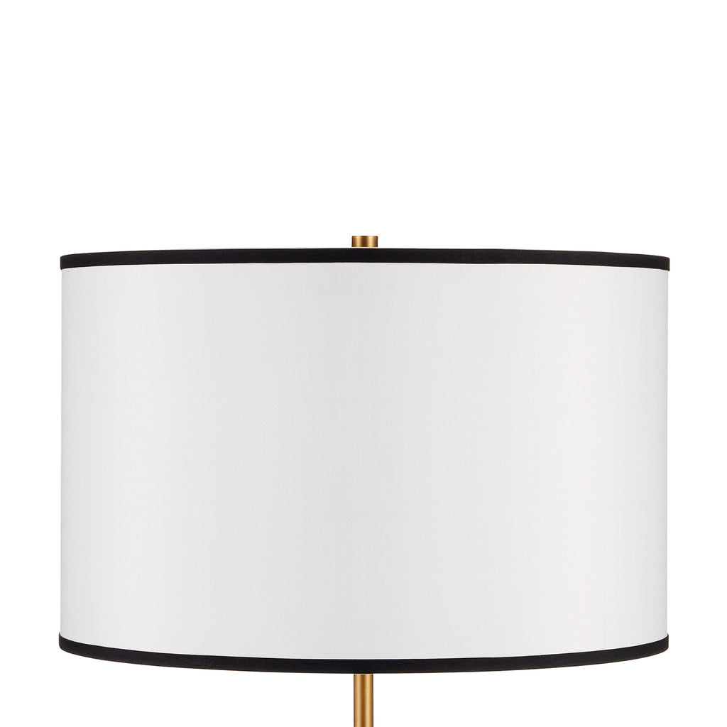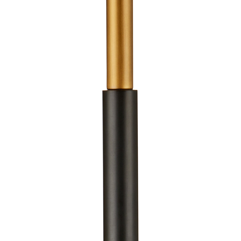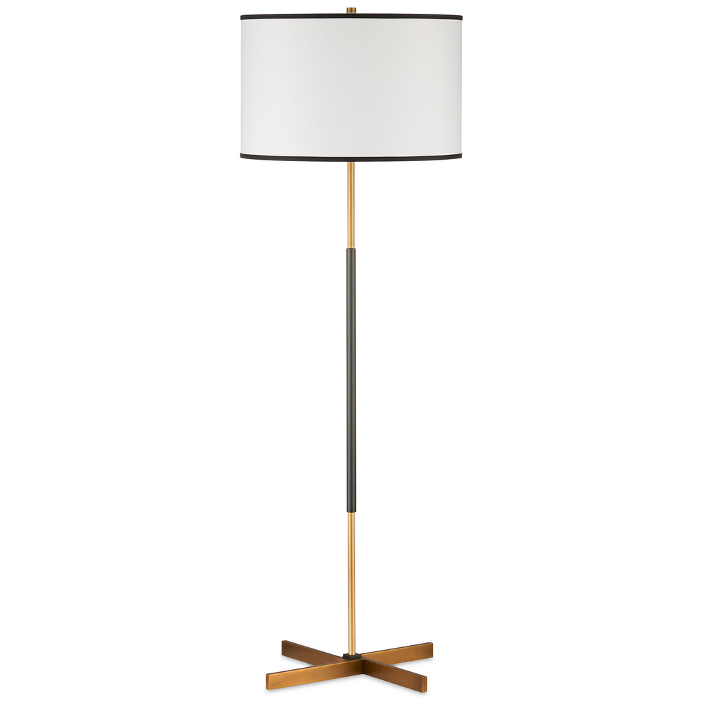 The jumping off point for the design of the Currey & Co Willoughby Floor Lamp was the pinwheel-shaped base. Ian Thornton was inspired to begin at the bottom and design up with this metal floor lamp in a mix of brass and oil-rubbed bronze finishes. Placing the bronze finish in the middle of the thin stem and choosing an off-white shantung shade with black trim were artful moves that bring this composition cohesion.