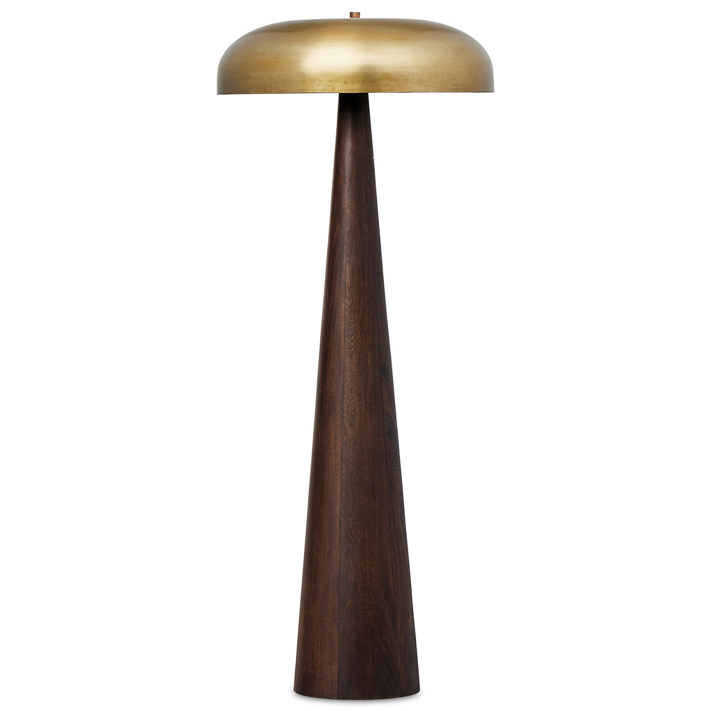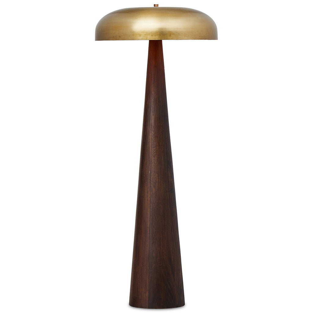 A stylish nod to midcentury mushroom lamps, this beautifully scaled wood lamp features a gleaming metal shade finished in aged brass. It's topped with a small wood finial to complete the look.