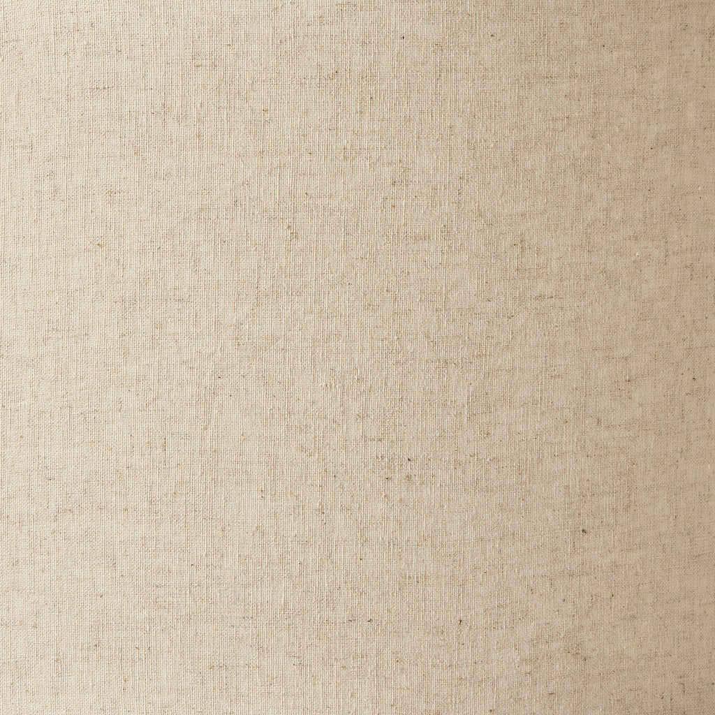 Monochrome material. Flax linen covers a classic cylindrical base, topped with a round, low drum-style shade — a modern shape and play on proportions. Brass rotary and finial detail on top break up the all-linen look.