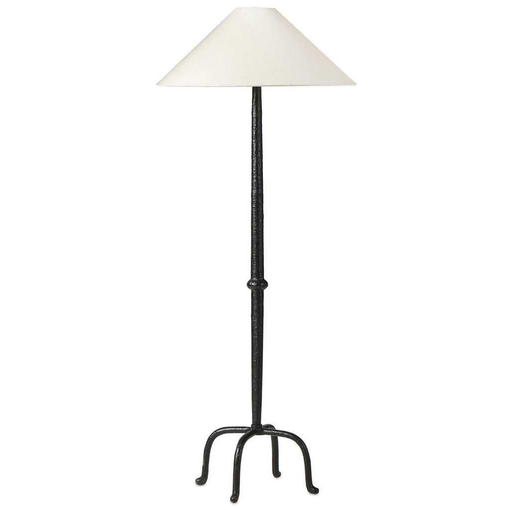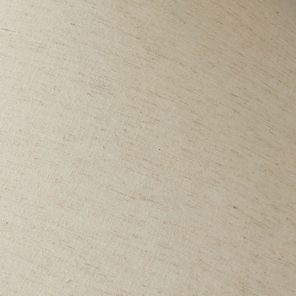 Cast aluminum forms a candlestick-inspired base, accented with four legs for stability and character. A tapered linen shade offers a sleek finishing detail.