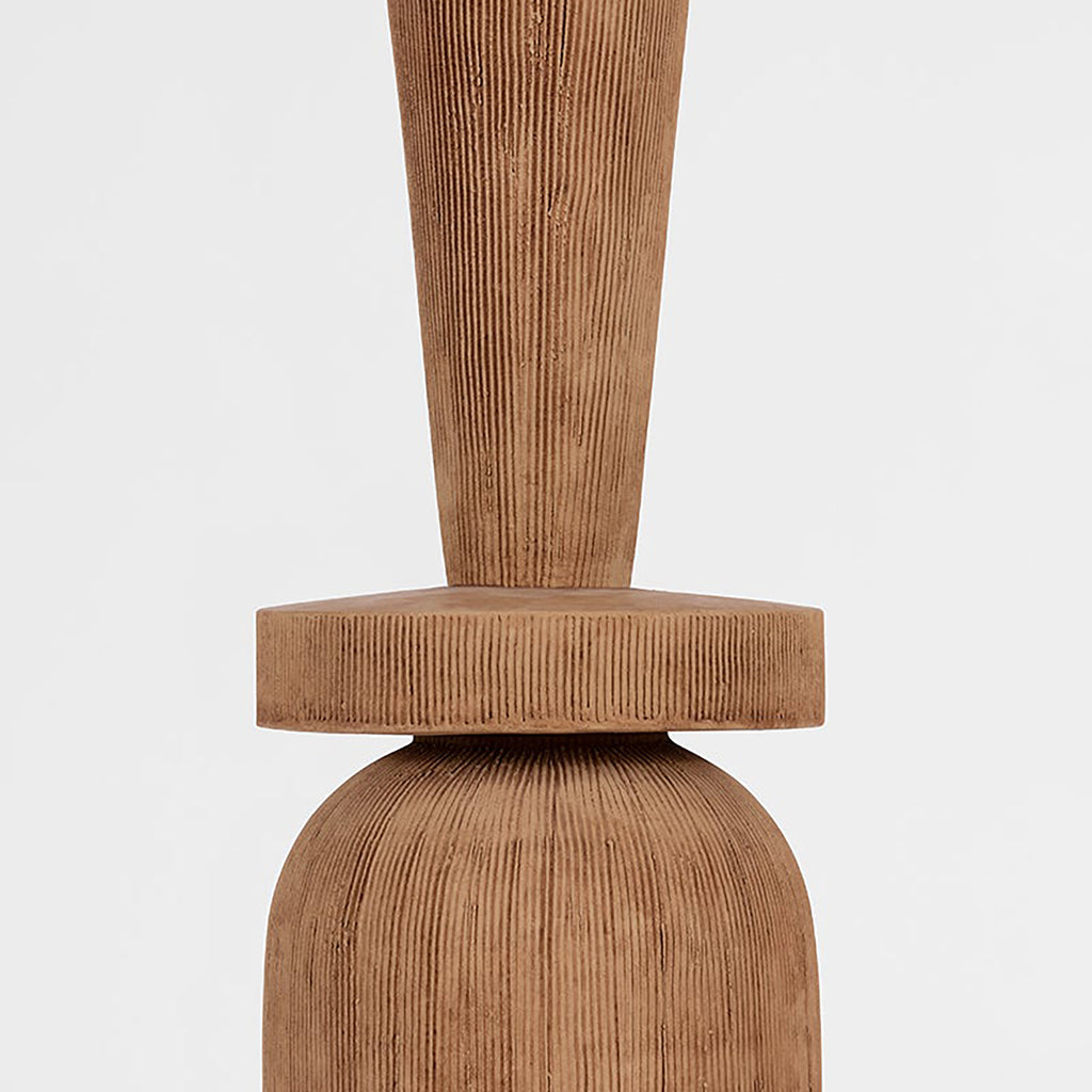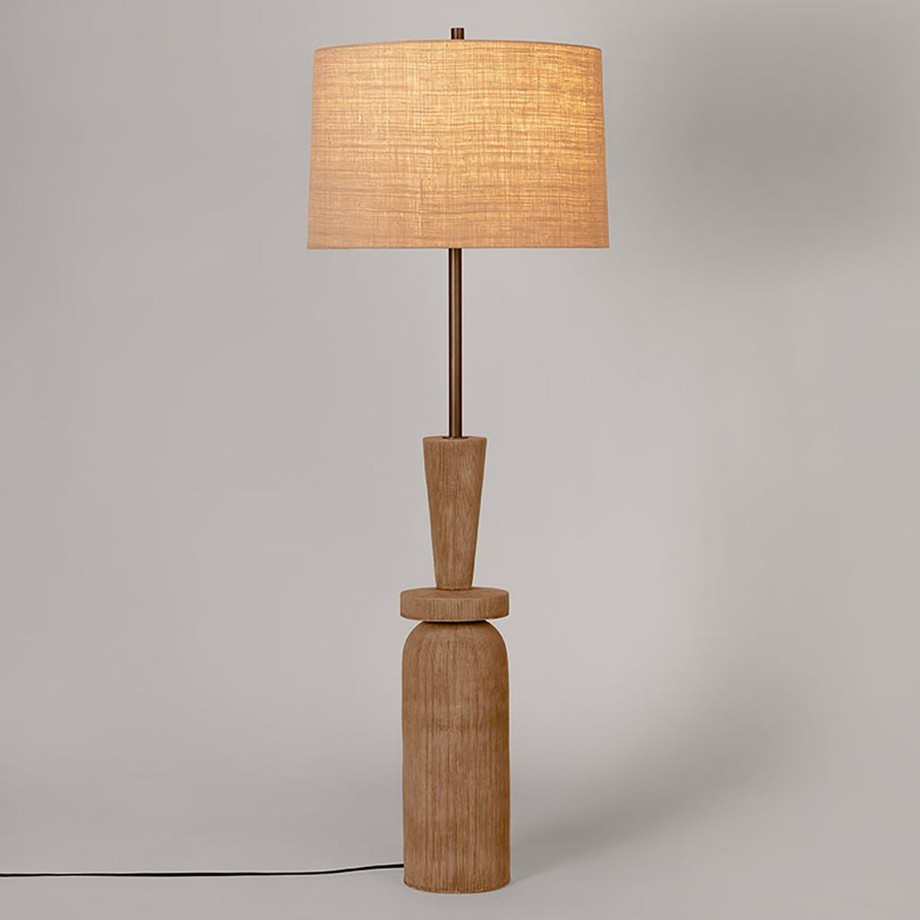 The statuesque Hudson Valley Lighting Kinloch floor lamp is all about distinctive shapes and textures. While it mimics the appearance of wood, the stacked geometric base is a tactile Ash Brown ceramic. A sleek metal stem finished in Bronze Leaf connects the base to a raffia fabric drum shade, resulting in a mixed-material blend of warm neutrals. Add this bold lamp to an earthy, modern interior.