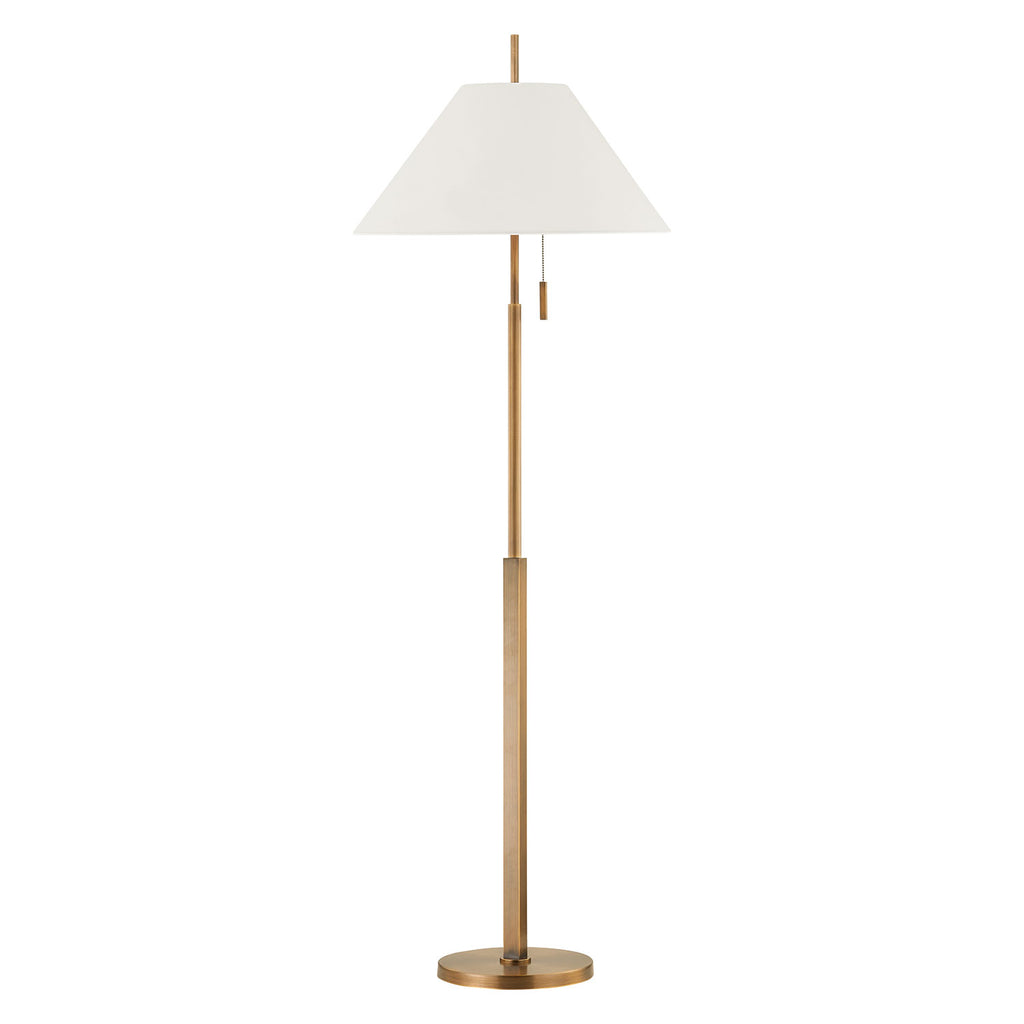 Casual, sophisticated, and little bit curious, express yourself with eclectic, artisan-made lighting by Troy. The Troy Clic floor lamp is classic and tailored. An extruded square body set atop a circular base extends into a slim pole that pierces through a tapered, off-white linen shade to create a layering of simple geometry. The pull chain adds a stylish and functional detail, while the all-over Patina Brass finish contributes to the sophistication of this collection. Clic is available as a floor and table lamp.