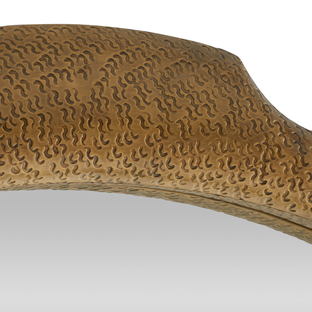 Evocative of an ancient shield, a bullnose frame of brass clad is finished with a hammered squiggle texture. Its robust form is designed to be displayed vertically with either the smaller or broader end at the top. Cleat attachment for secure hanging.