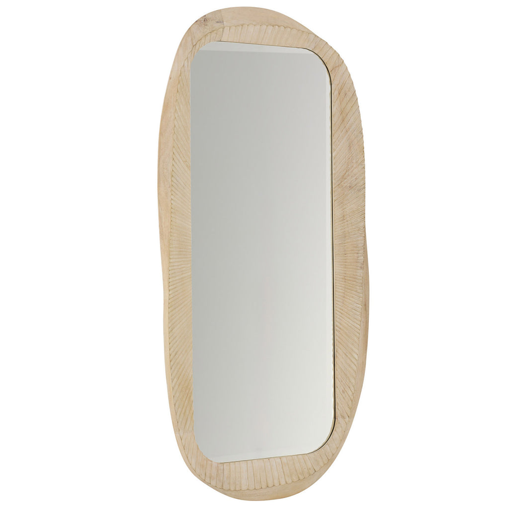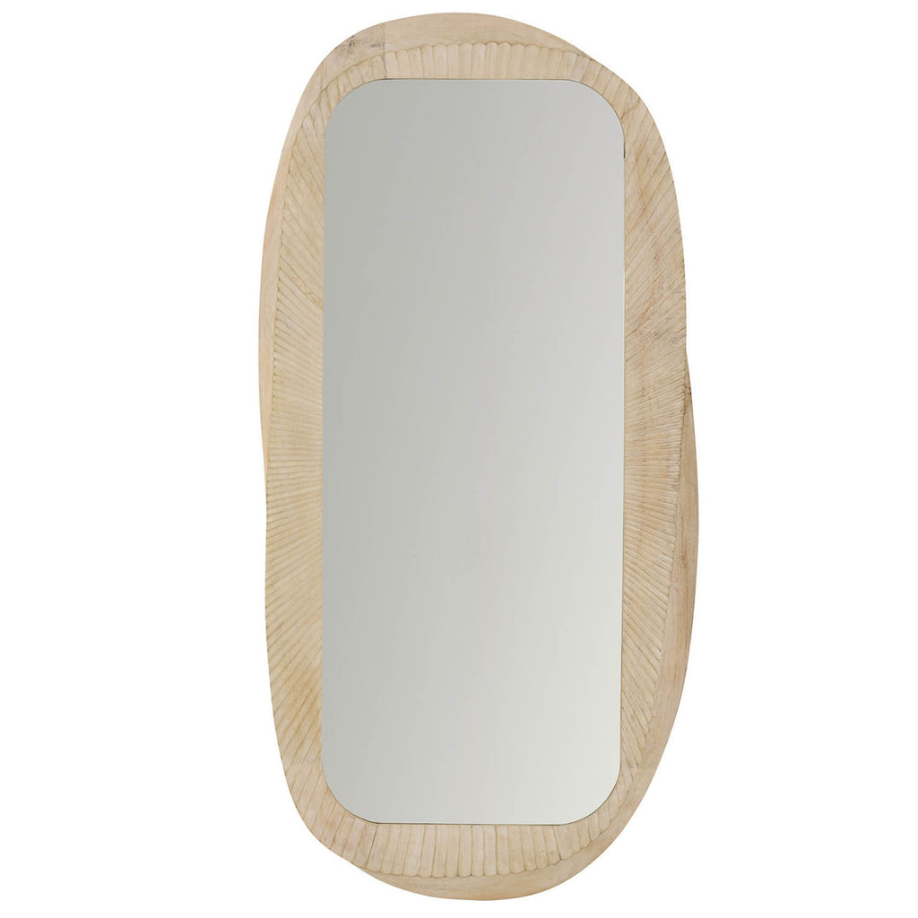 Inspired by the grooved finish of a tree slice, our hand-carved frame of whitewash mango wood is a naturally wonderful addition to an entryway. Subtle indentations add movement and texture. This rectangular glass mirror can be hung horizontally or vertically by a back cleat. Hanging hardware included. Finish will vary.