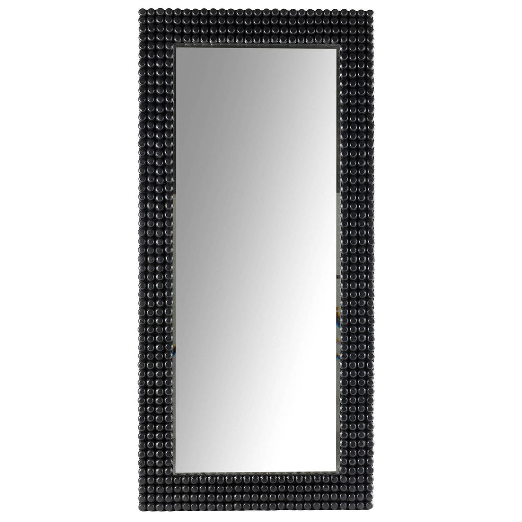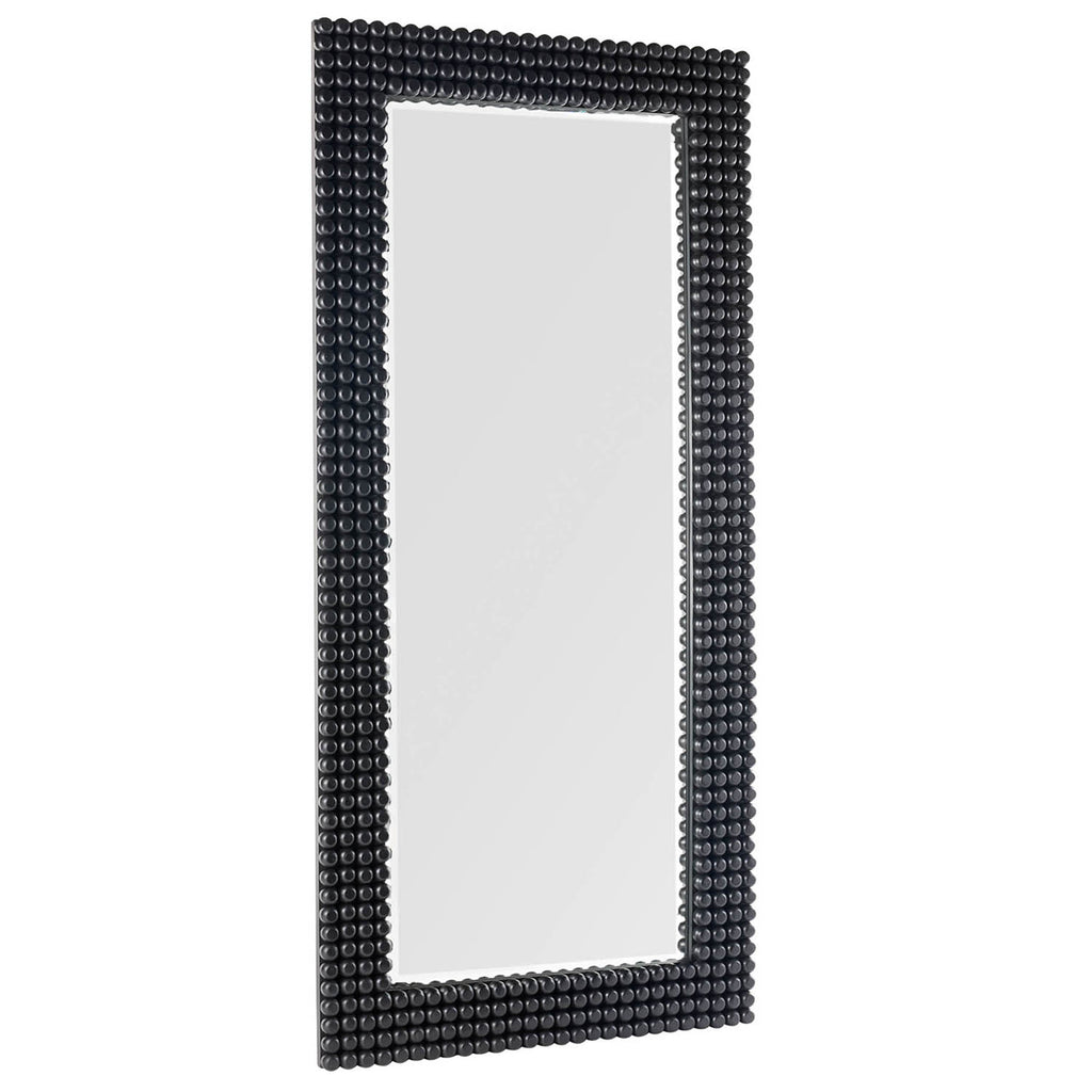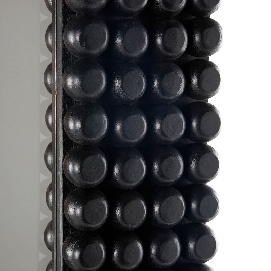Filled with visual and tactile textures, the Paxton mirror is a beautiful work of craftsmanship. Every single knob is hand carved from solid wood, then affixed to the frame to be finished in a rich, black stain. The look is African-inspired, but with a modern leaning. Beveled mirror. Also available in a small version (4616).