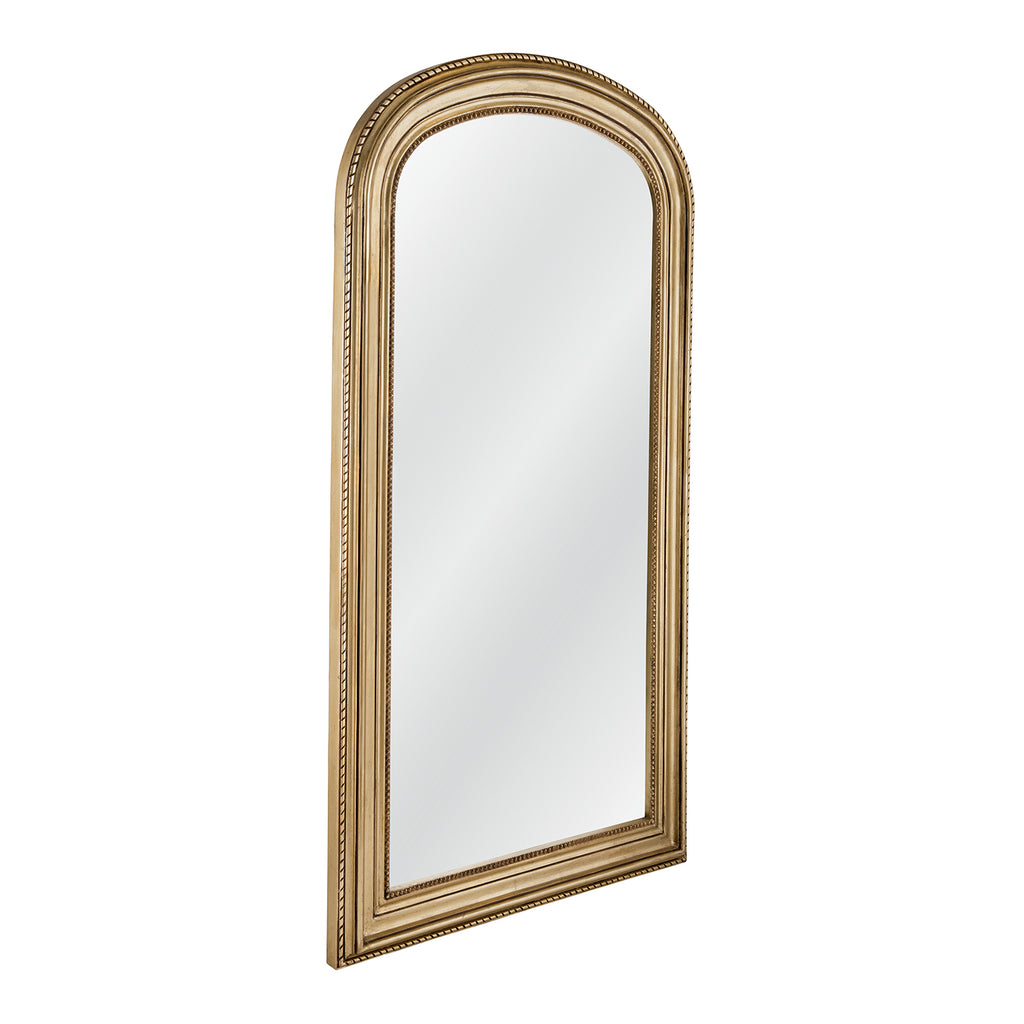 The Baez Floor Mirror features a sophisticated design with a thick layered molding and an arched top, exuding opulence. Its luxurious gold gilt finish enhances its glamorous and sophisticated appearance, elevating any space it adorns. Combining elegance with modern aesthetics, this mirror becomes a captivating and stylish focal point in any interior setting.