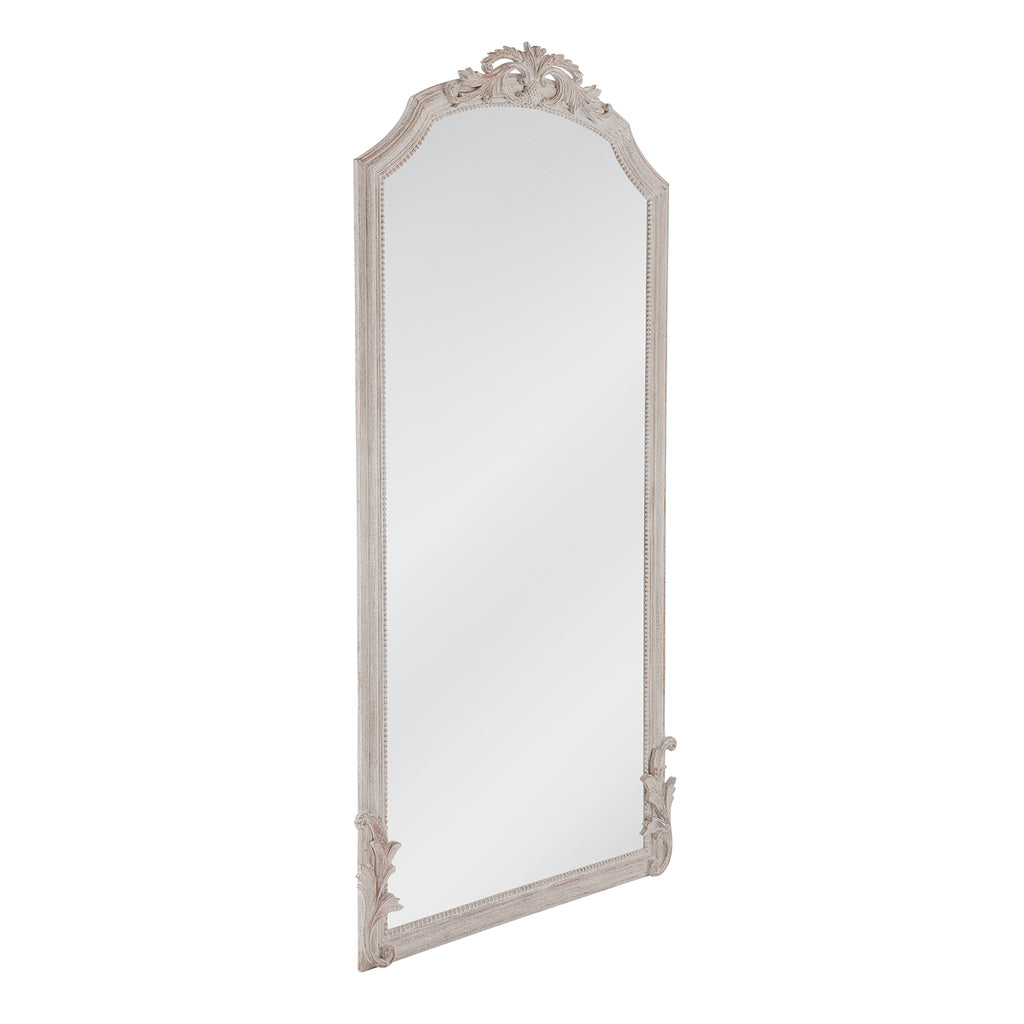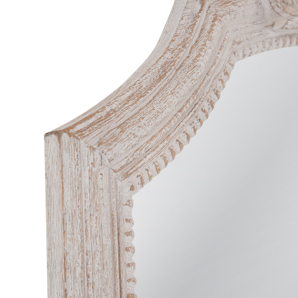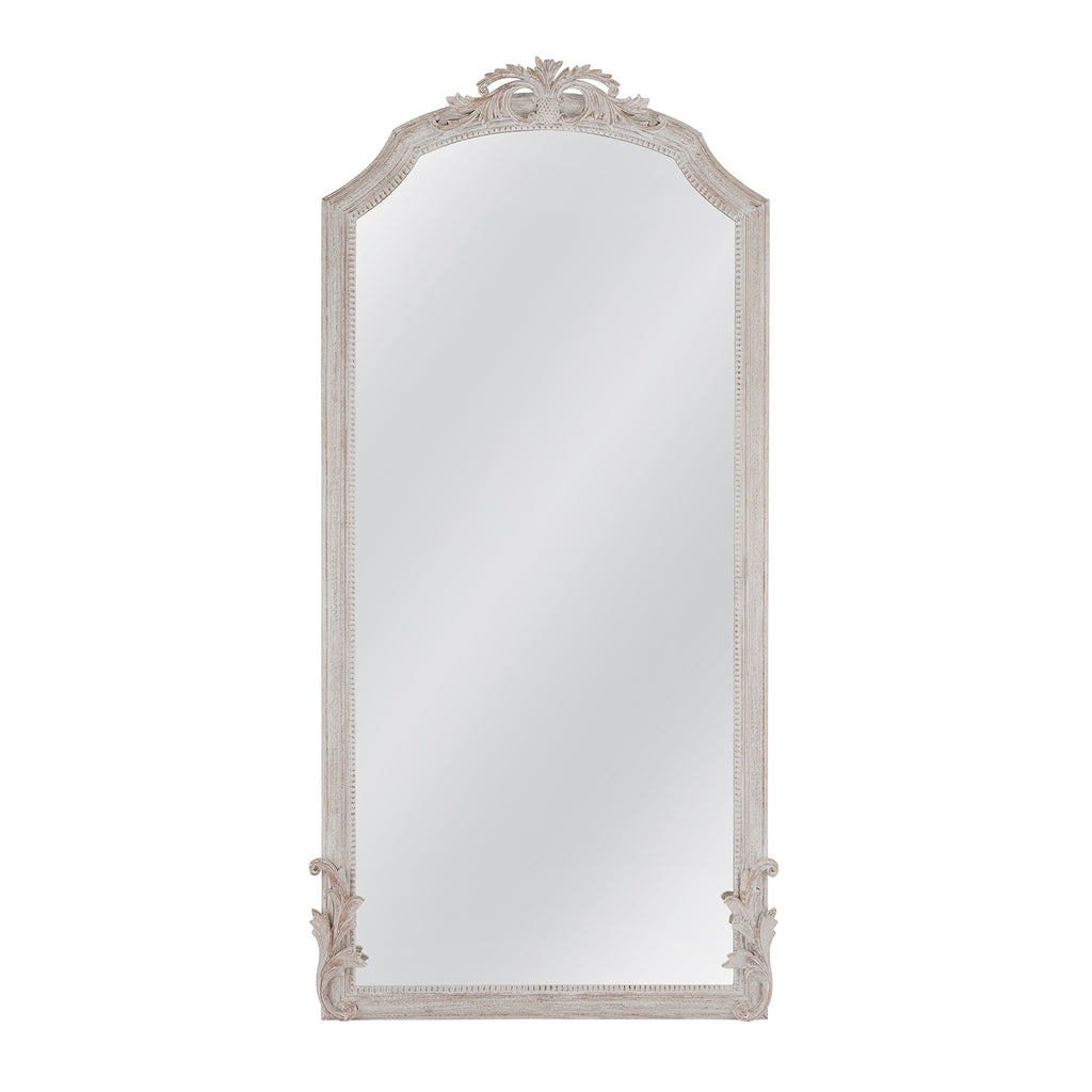 The Coltrane Floor Mirror combines elegance and charm with its rectangular shape and arched decorative pediment top. Ornate details on the base sides enhance its sophistication. Crafted from wood and finished in distressed white, it exudes timeless farmhouse appeal.
