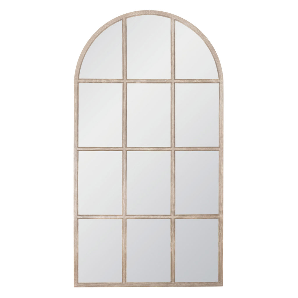 Create the look of a more spacious space with the Grid Arched Mirror by Essentials For Living. This stunning transitional-style mirror seamlessly blends classic and contemporary design elements. Featuring an arched solid oak frame with a classic natural gray finish, this mirror showcases exquisite double lamb's tongue wood edge detailing. Crafted from high-quality solid oak wood, plywood, and glass, it offers both durability and elegance. With impressive dimensions of 46in wide, 2in deep, and 84in high, this oversized mirror is perfect for floor use. You can easily lean it against the wall and secure it with the included hardware to ensure stability and safety.