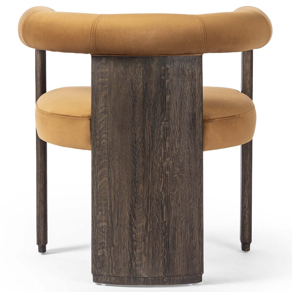 For a confident mix of soft curves and clean lines, this three-leg dining chair pairs a solid oak frame and low barrel back with rich, rust-colored upholstery.