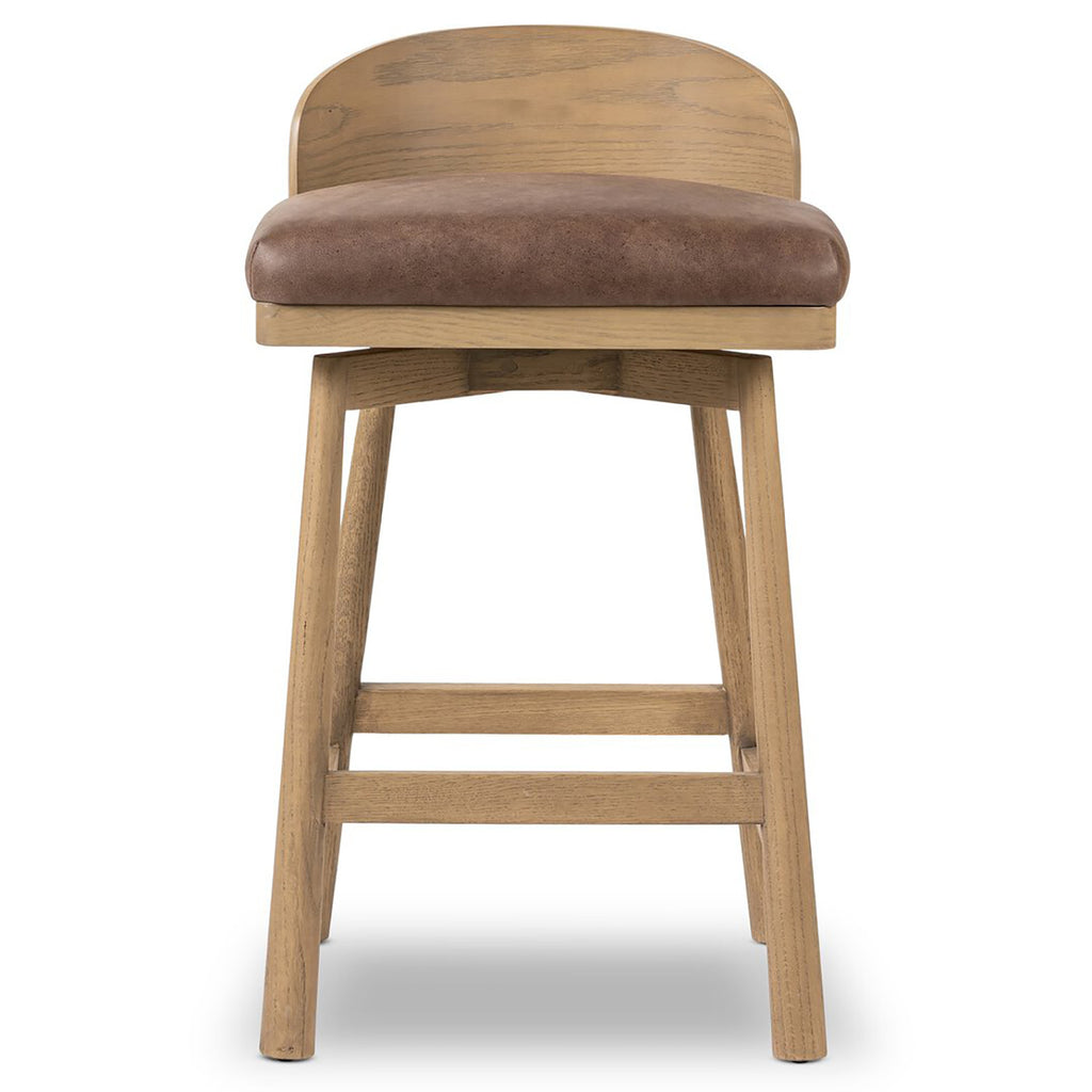 Channel vintage vibes with a swivel stool perfectly sized for the counter. Crafted of blonde-finished oak, a low, molded back adds a playful touch, while a top-grain leather seat offers luxe comfort. Finished off with a memory swivel to ensure the stool's curved wood back stays perfectly aligned.