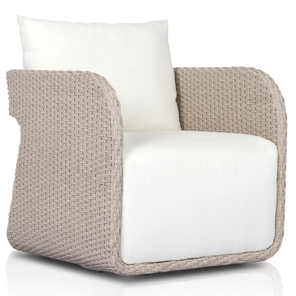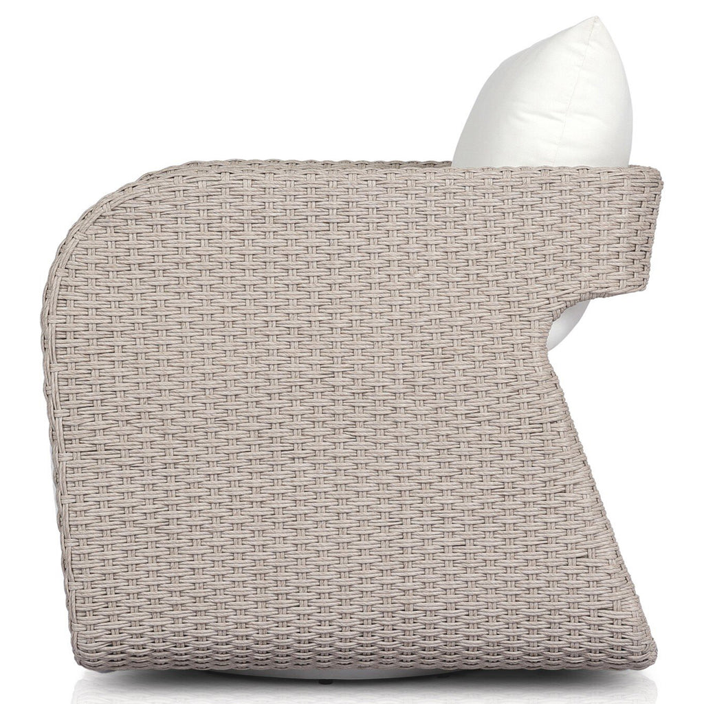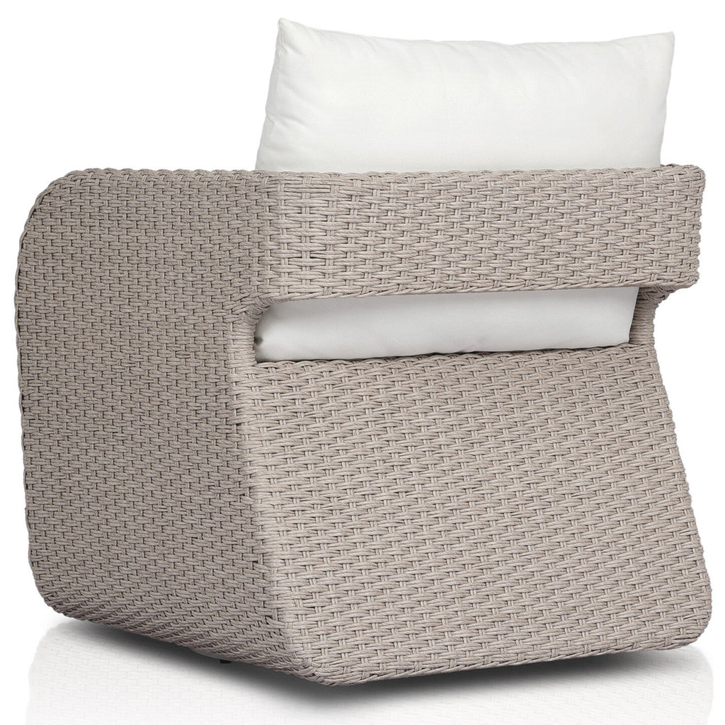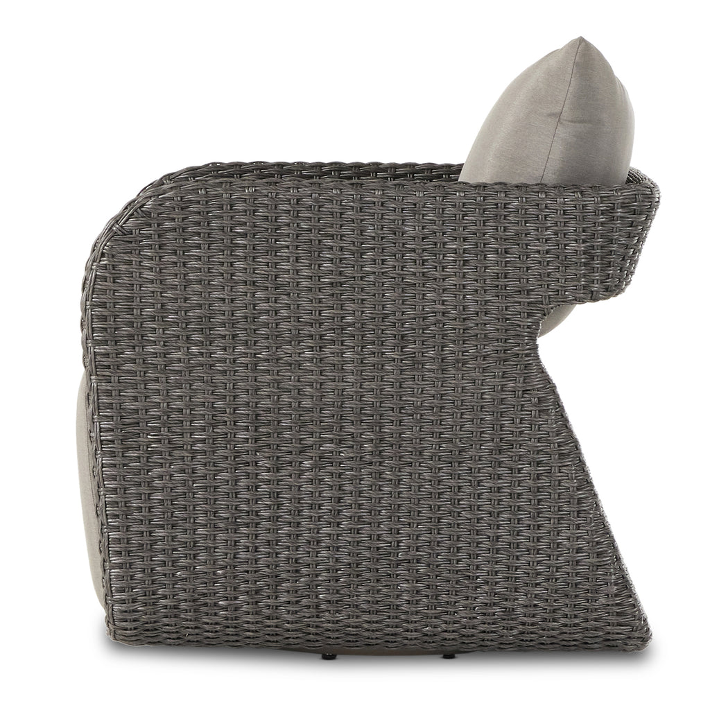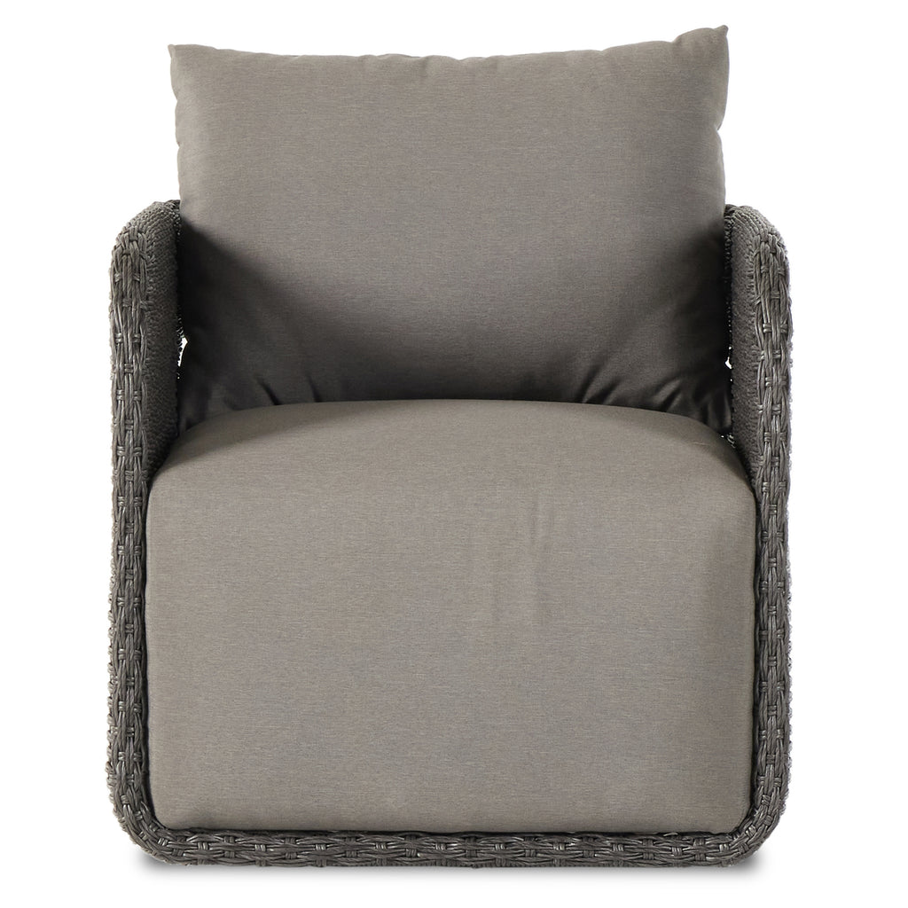 Work some texture into your outdoor styling. Charcoal all-weather wicker shapes a wraparound frame with rear cutout detailing, finished with a 360 swivel. Thick and durable, light gray seating makes this whole outdoor swivel chair modern and monochromatic. Cover or store indoors during inclement weather and when not in use.