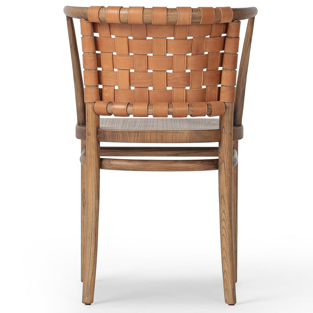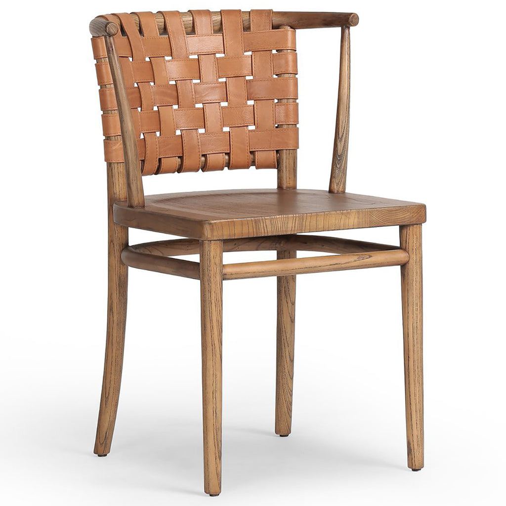 For a fresh take on the bistro-style dining chair, a barrel seatback of woven leather is framed by toasted nettlewood. Petite scaling, perfect for smaller spaces.