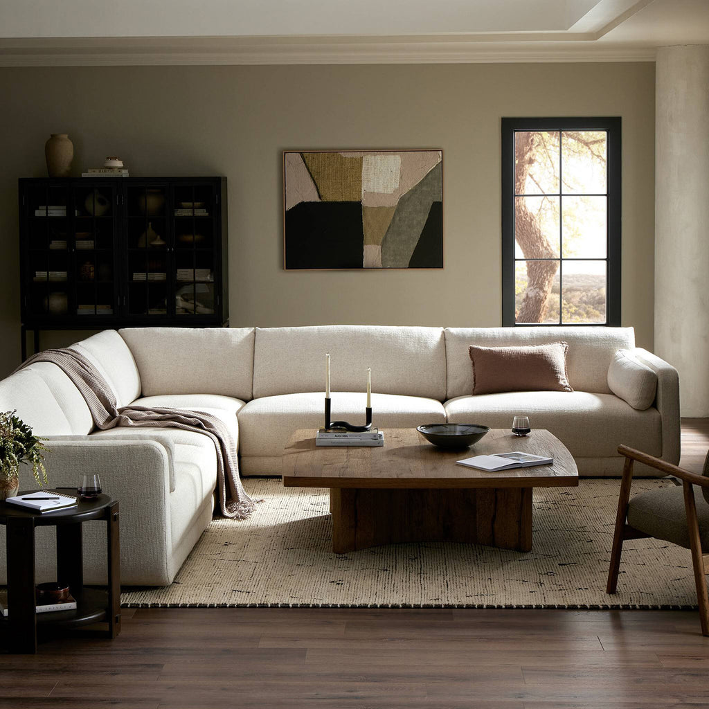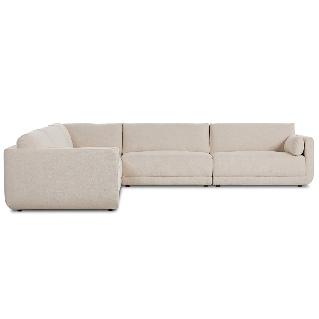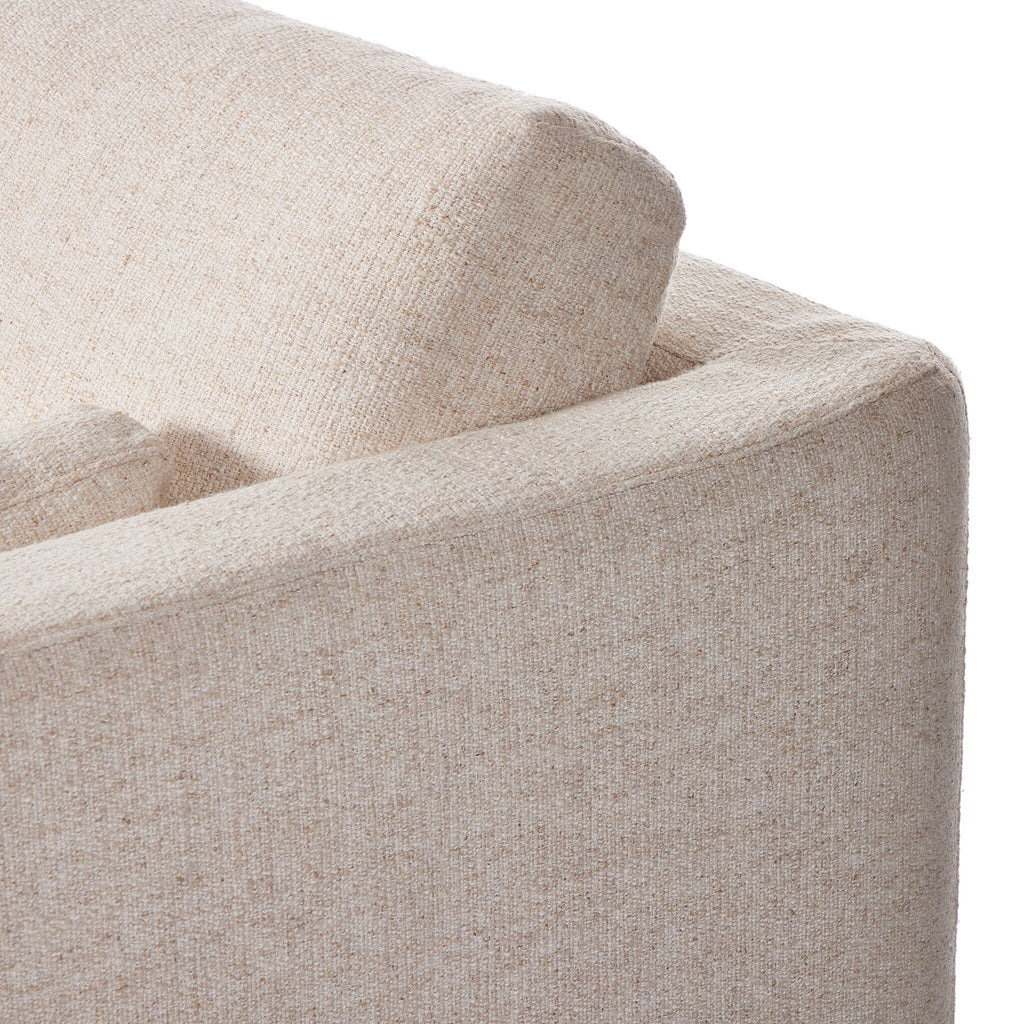 An elevated take on the modular sectional. This new collection features clean lines with loose back and arm cushions. A smooth linear base is fully upholstered and wraps up the arms for a shelter effect. Covered in a new basketweave cream fabric that brings both texture and comfort to the entire piece.