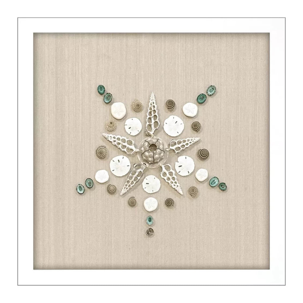 Various seashells are meticulously mounted by hand and accented with a decorative paper. Framed in a white lacquered wood shadow box style moulding.