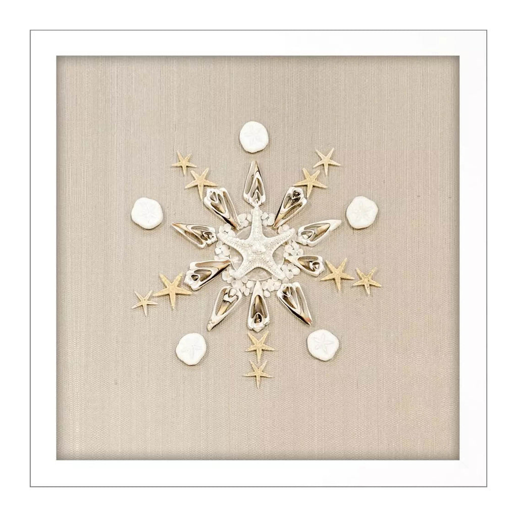 Various seashells are meticulously mounted by hand and accented with a decorative paper. Framed in a white lacquered wood shadow box style moulding.