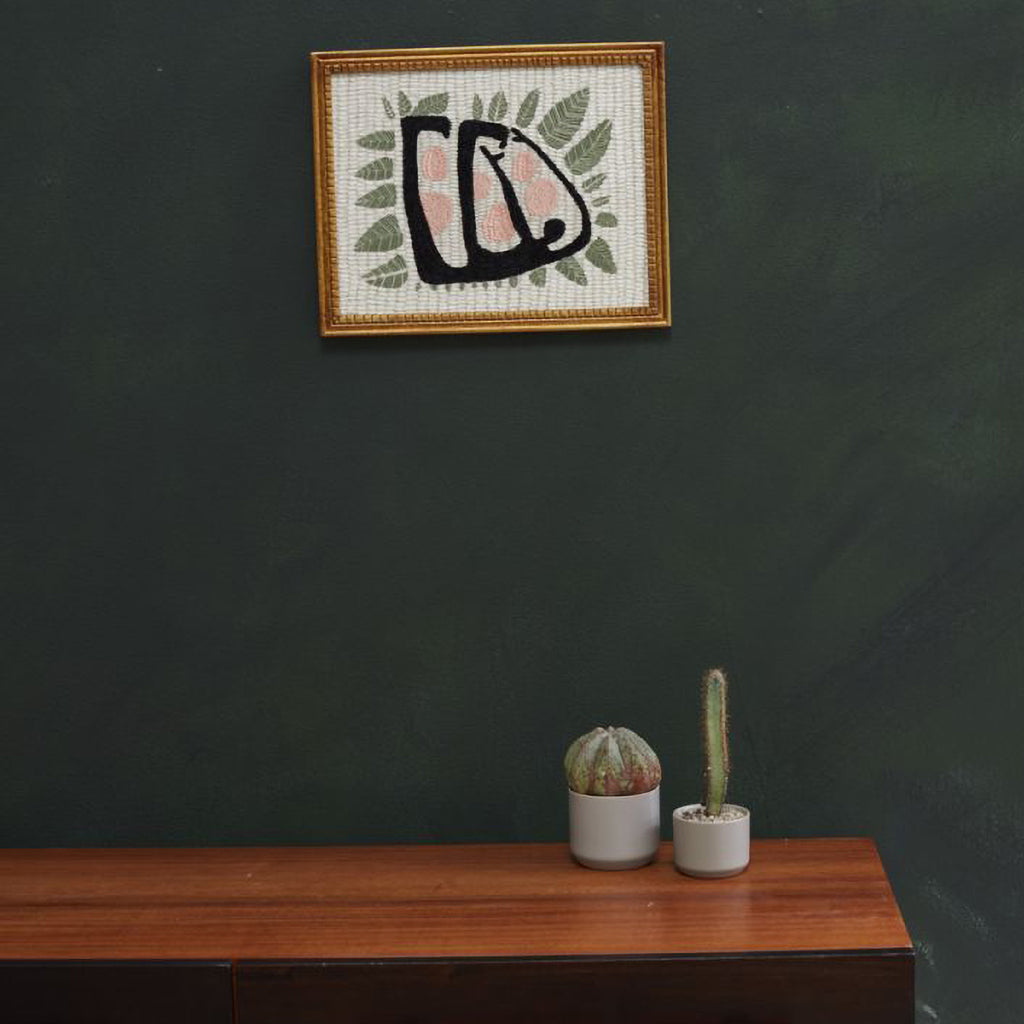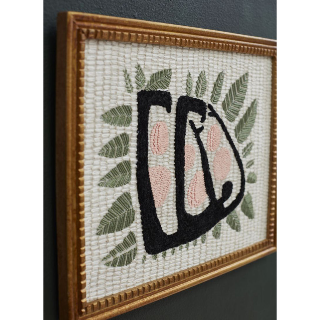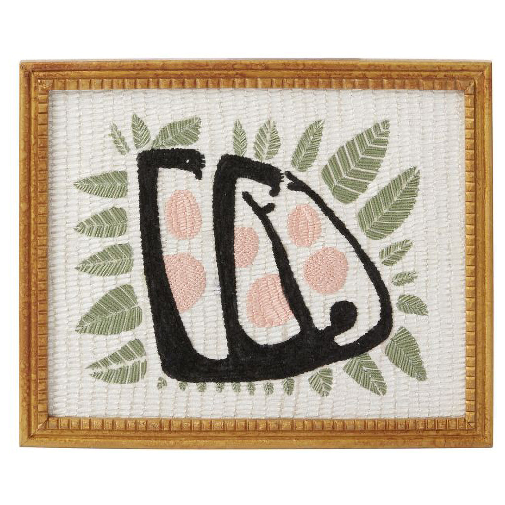 Add embroidered texture to your walls with the framed Otomi Wall Art, featuring an intricate figure surrounded by leaves, inspired by ancient Latin American artwork & colors. This small wood-framed textile is lovely layered into a gallery wall.