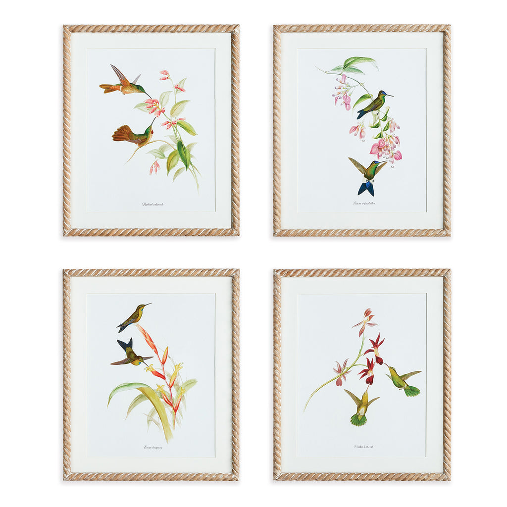 Incredibly intricate, yet whimsical in style, these hummingbird prints are a traditional set. May be hung together, or separated into smaller vignettes. Finished off with mats and carved wood frames, a great way to dress your walls in classic style.