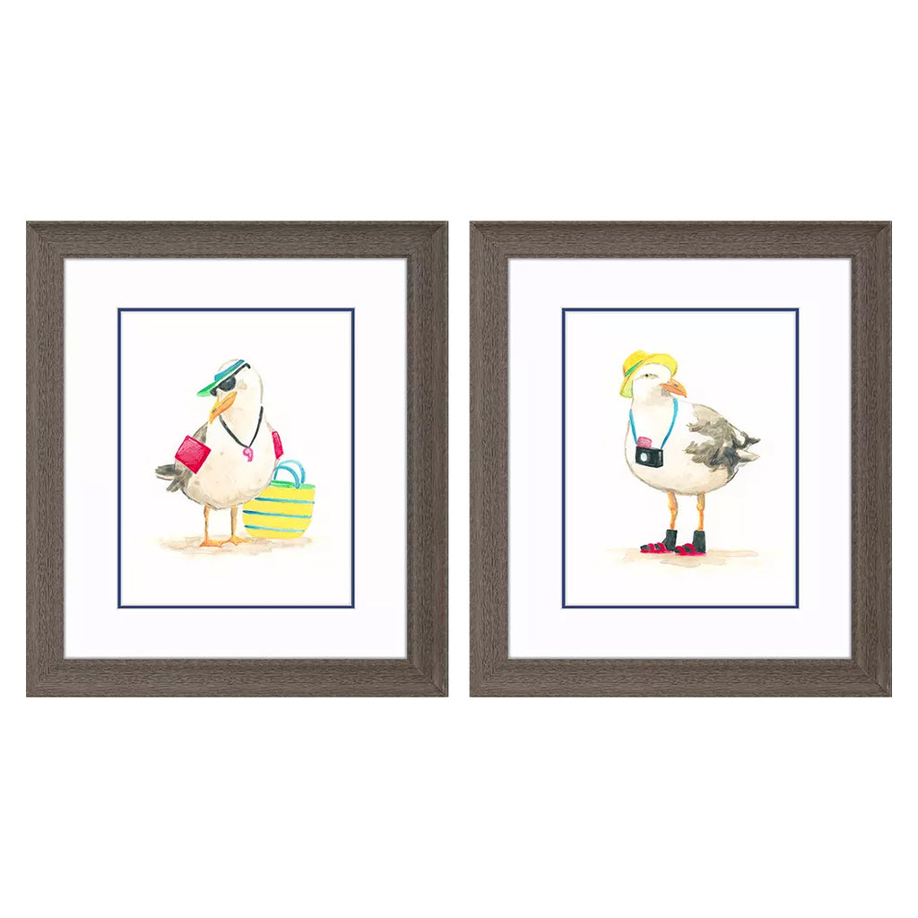 Hip birdies head to the beach. This colorful cast of characters is matted in white and framed in a rustic wood-grain finish moulding.