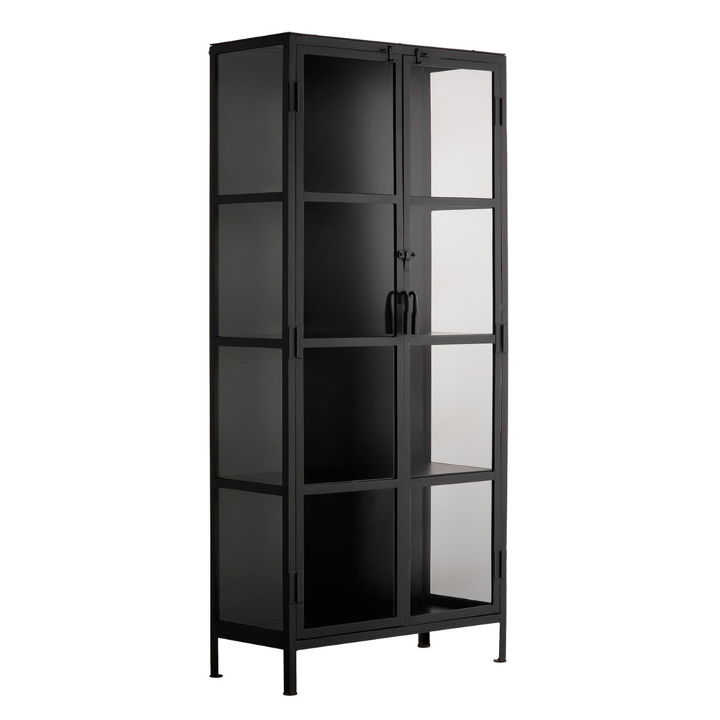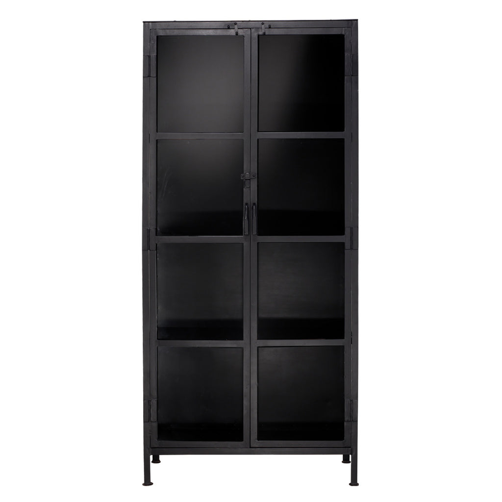 Glass panes are encased in simple black metal to create a minimalistic cabinet perfect for storage or display. The Jamie Young Union tall curio cabinet is intended to have a rustic appearance that may include spotting and variances in tone and luster. Each curio is handmade by artisans to be unique, no two are alike.