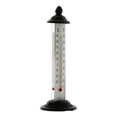 This outdoor thermometer flawlessly marries function with style; encased in a cast iron frame the glass-protected thermometer indicates the temperature in both Fahrenheit and Celsius.