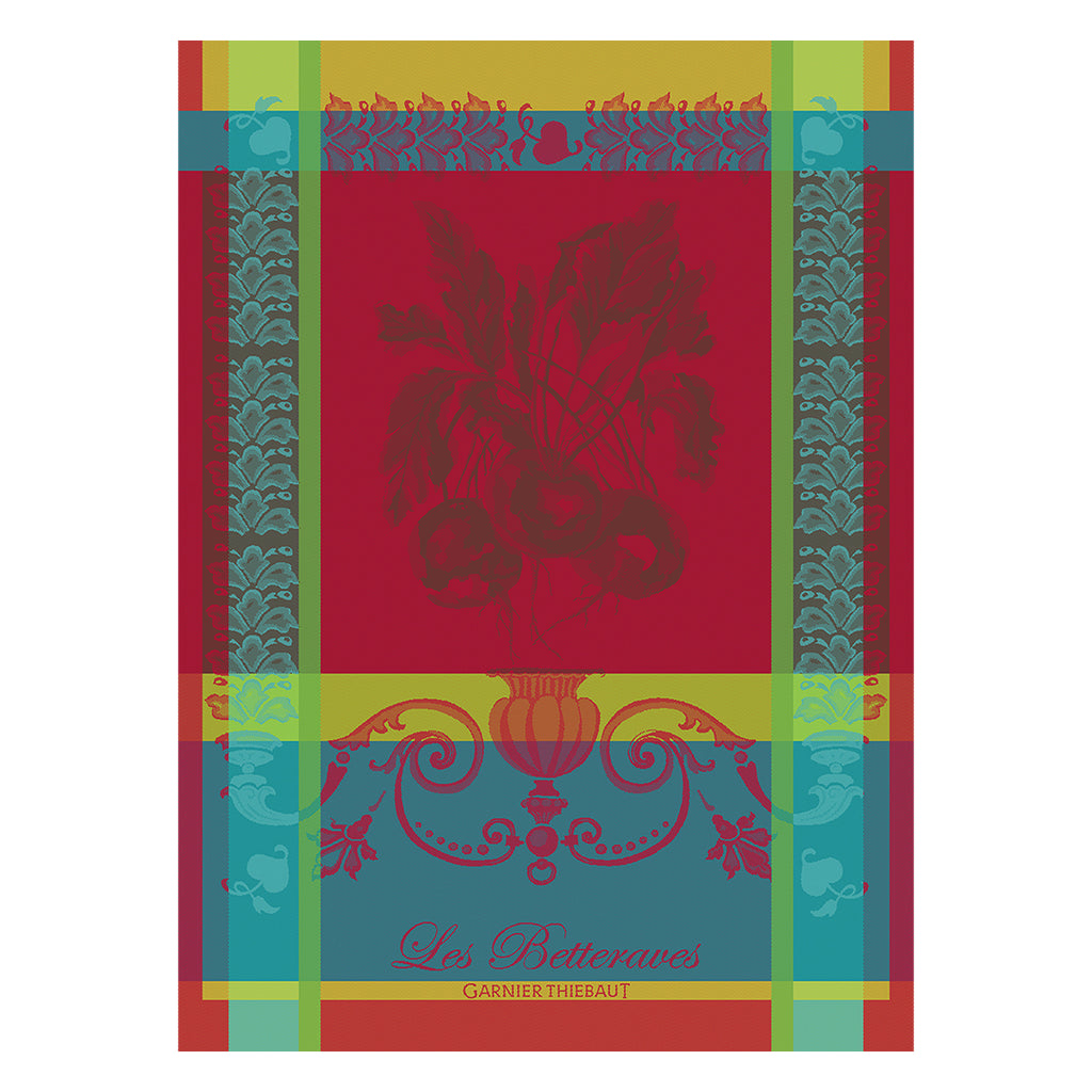 Add a dash of fun to your kitchen with this vibrant beet-themed towel! Perfect for brightening up your space, this Les Betteraves Rouge Kitchen Towel features a playful beet design that's sure to make you smile in shades of red, pink, blue, and green. This woven design was crafted from original artwork, hand-drawn by our in-house team of textile artisans & designers in France. Constructed on jacquard looms with extra long staple cotton, Garnier Thiebaut USA's jacquard kitchen towels are woven for longevity, and can last for generations with the proper washing maintenance and use.