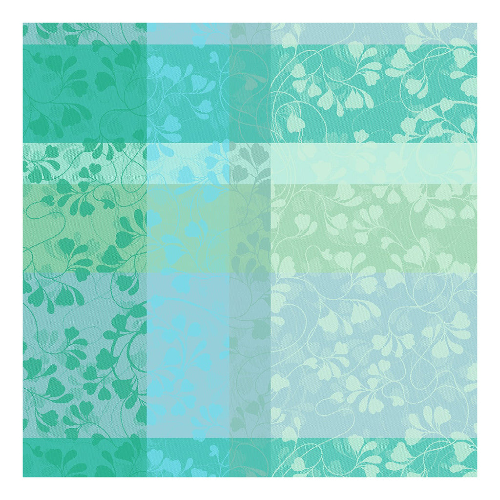 The Mille Feuillages Turquoise Napkin by Garnier Thiebaut features intertwining turquoise leaves in shades of green, blue, and cream. Woven on jacquard looms from extra-long staple cotton, this napkin showcases original hand-drawn artwork by in-house artisans. It offers both elegance and durability for your table setting.