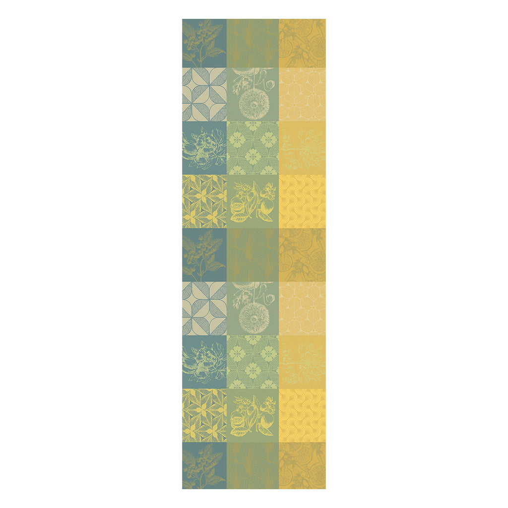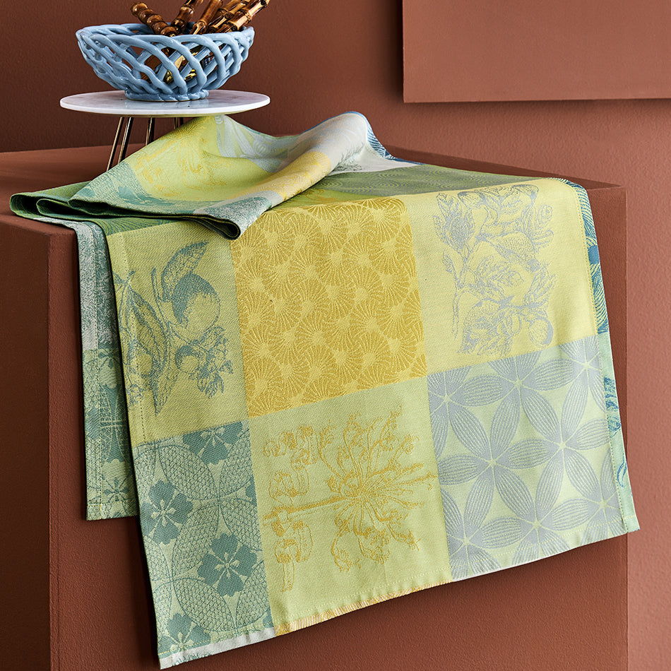 Discover the green, yellow, and blue patchwork design of the Mille Parfums Limoni Tablerunner with flowers, fruit, and geometric motifs. This woven design was crafted from original artwork, hand-drawn by our in-house team of textile artisans & designers in France. Constructed on jacquard looms with extra long staple cotton, Garnier Thiebaut USA's jacquard table linen collections are woven for longevity, and can last for generations with the proper washing maintenance and use.