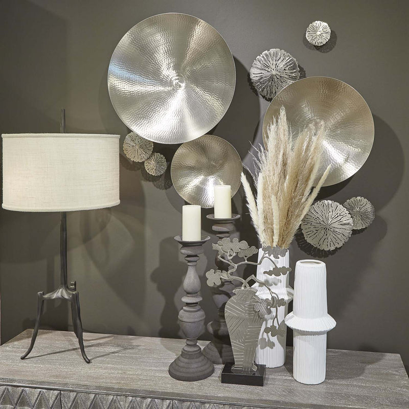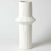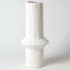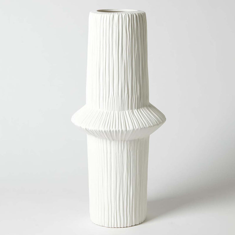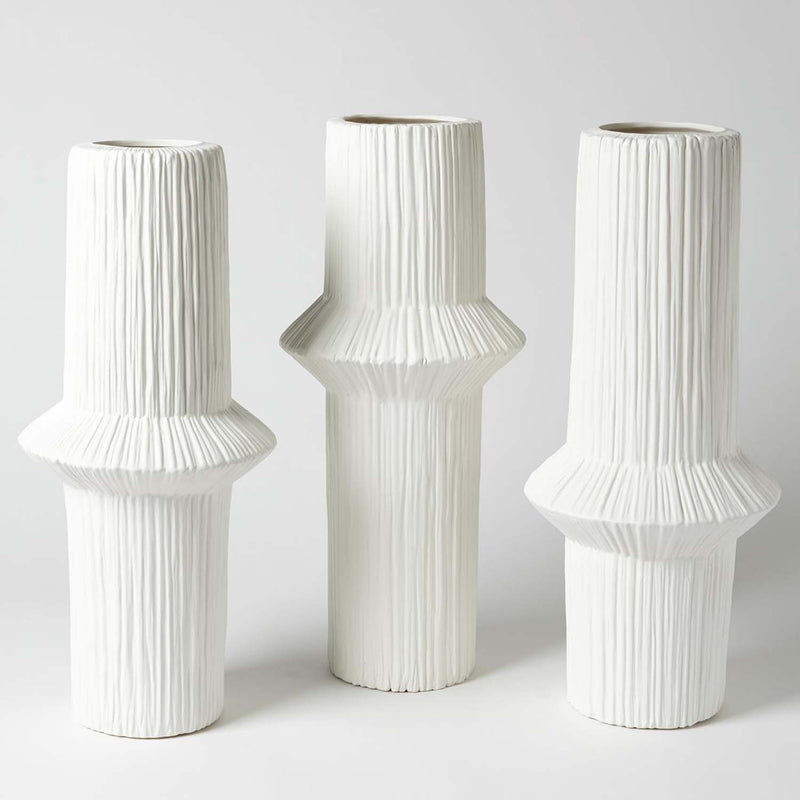 Impressive in size, our Global Views Ascending Ring vases each have a pointed collar that coordinates with its respective size. Heavily textured and finished in a matte white glaze.