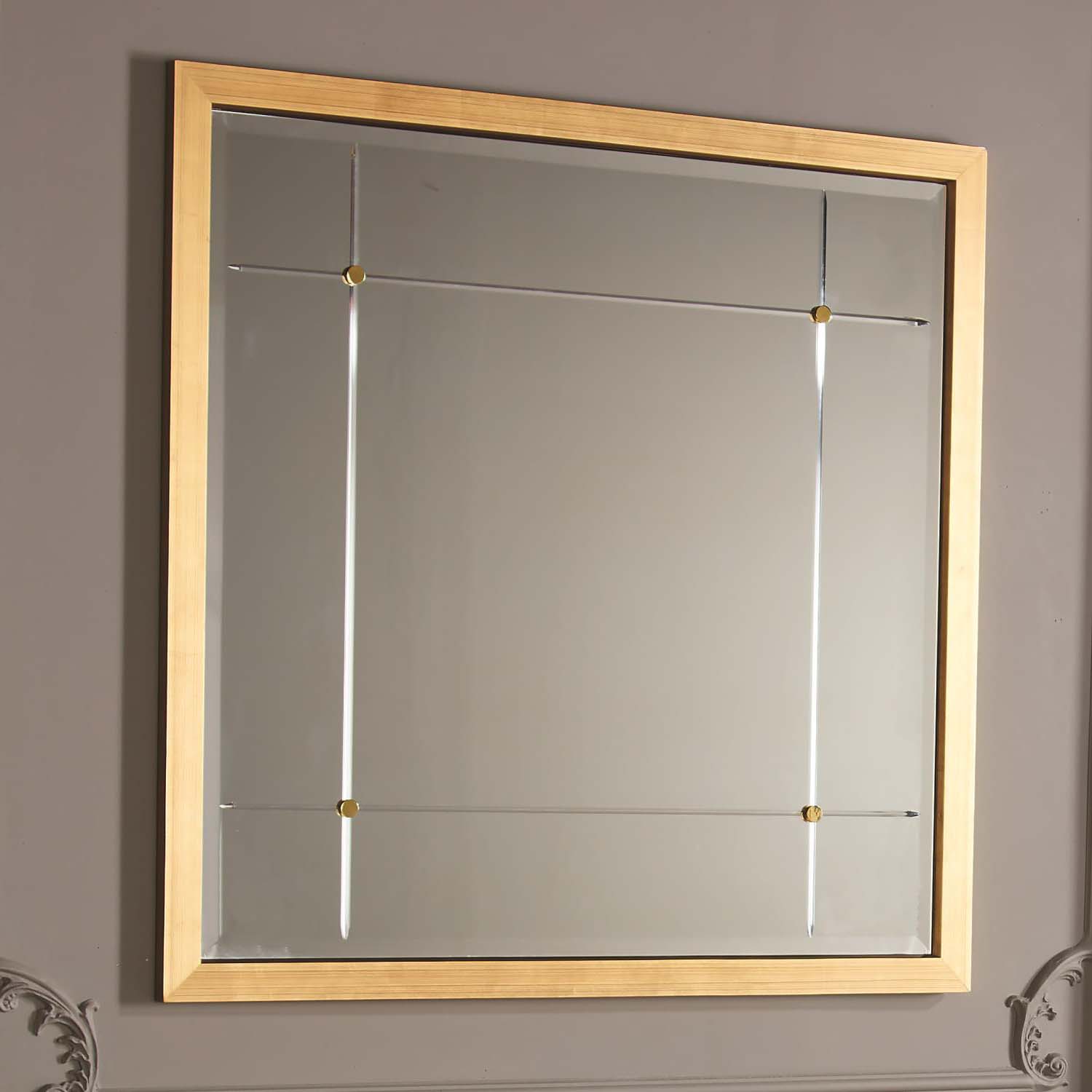 Mirror frame is made of solid pine with gold leaf finish. Decorative beveled cut pattern on mirror with brass clips.