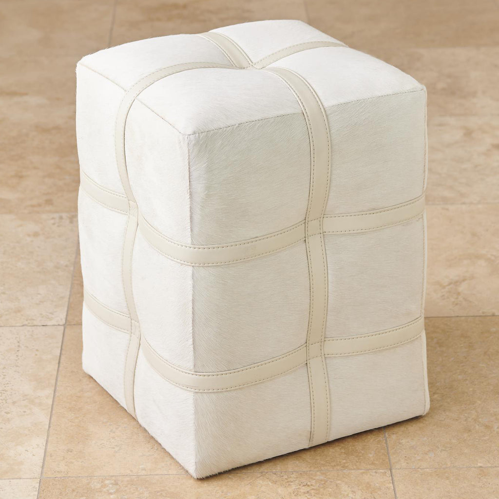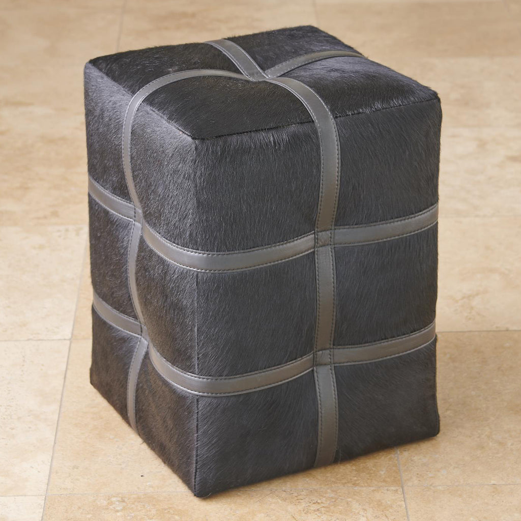 Petite square top hair on hide leather covered poof. Ideal height to use under a console or for extra seating around your living spaces. The hair on hide is covered with leather 'belts' following the same angular design of the entire piece. Made in India from top grain custom dyed cowhides. Available in Black or Ivory.