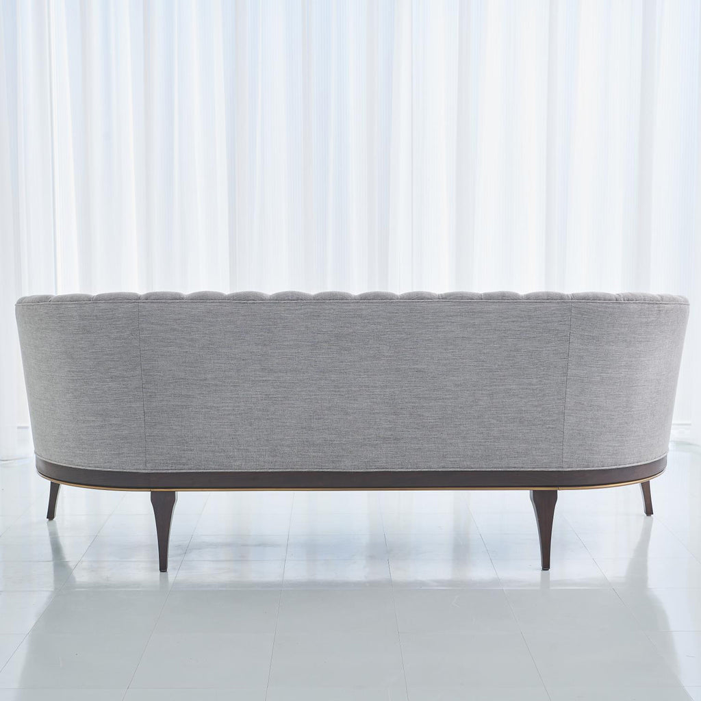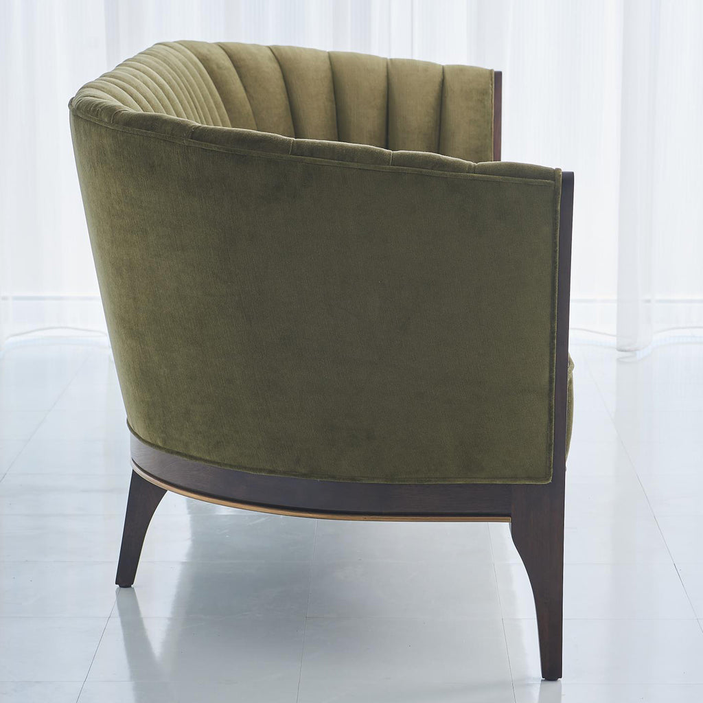 Custom designed by George Sellers, our Channel Back sofa is distinguished by deep channels of stitched, 100% cotton, moss green velvet or silversmith fabric around the back support. A beautiful wooden base supports the sofa and is accentuated along the bottom edge with a filet of solid brass running around the entire frame of the sofa. Elegant shapely legs and frame are finished in a dark waxed oiled walnut finish. Another distinct characteristic of this sofa is the arching back shape, as elegant and visually beautiful from the front or from a back view.