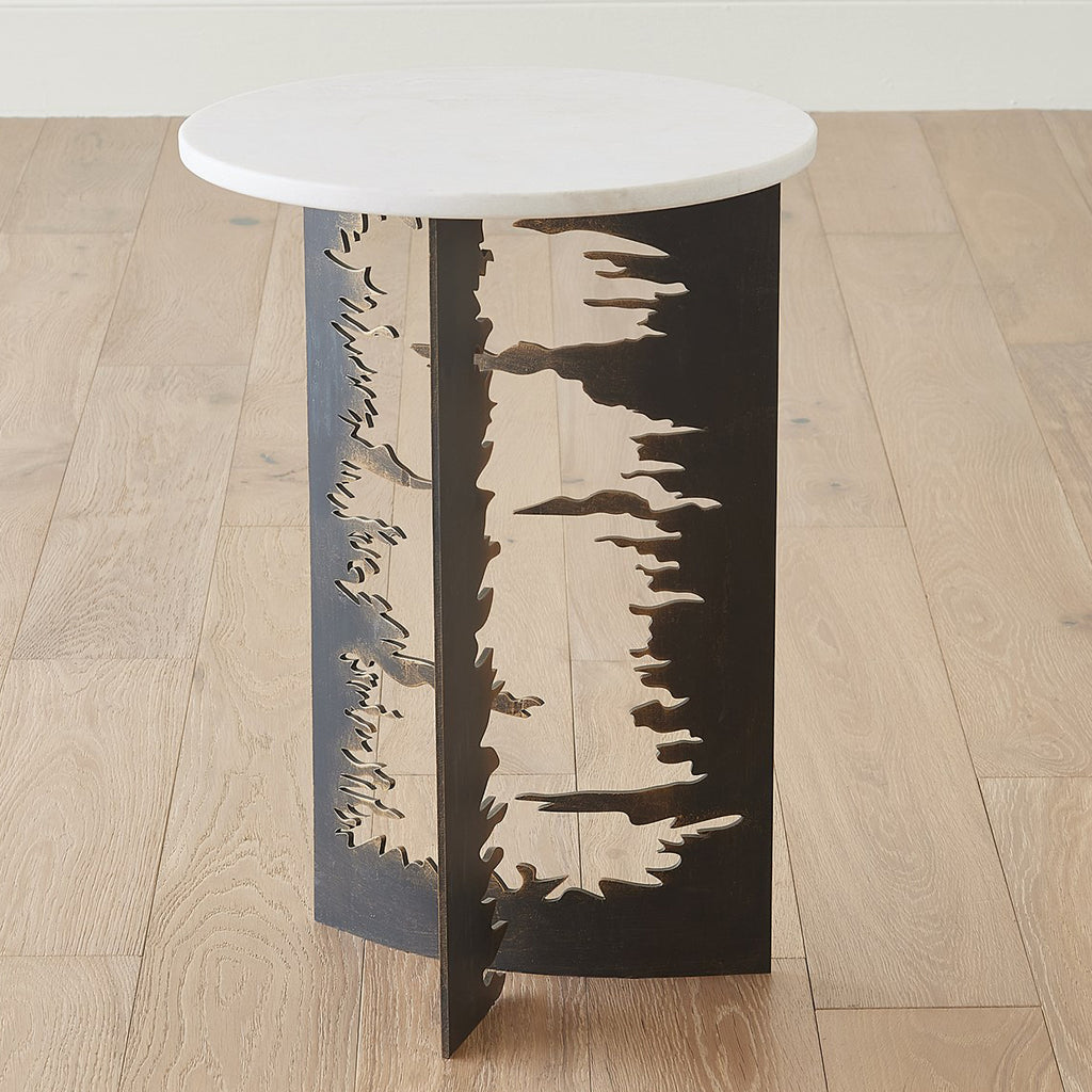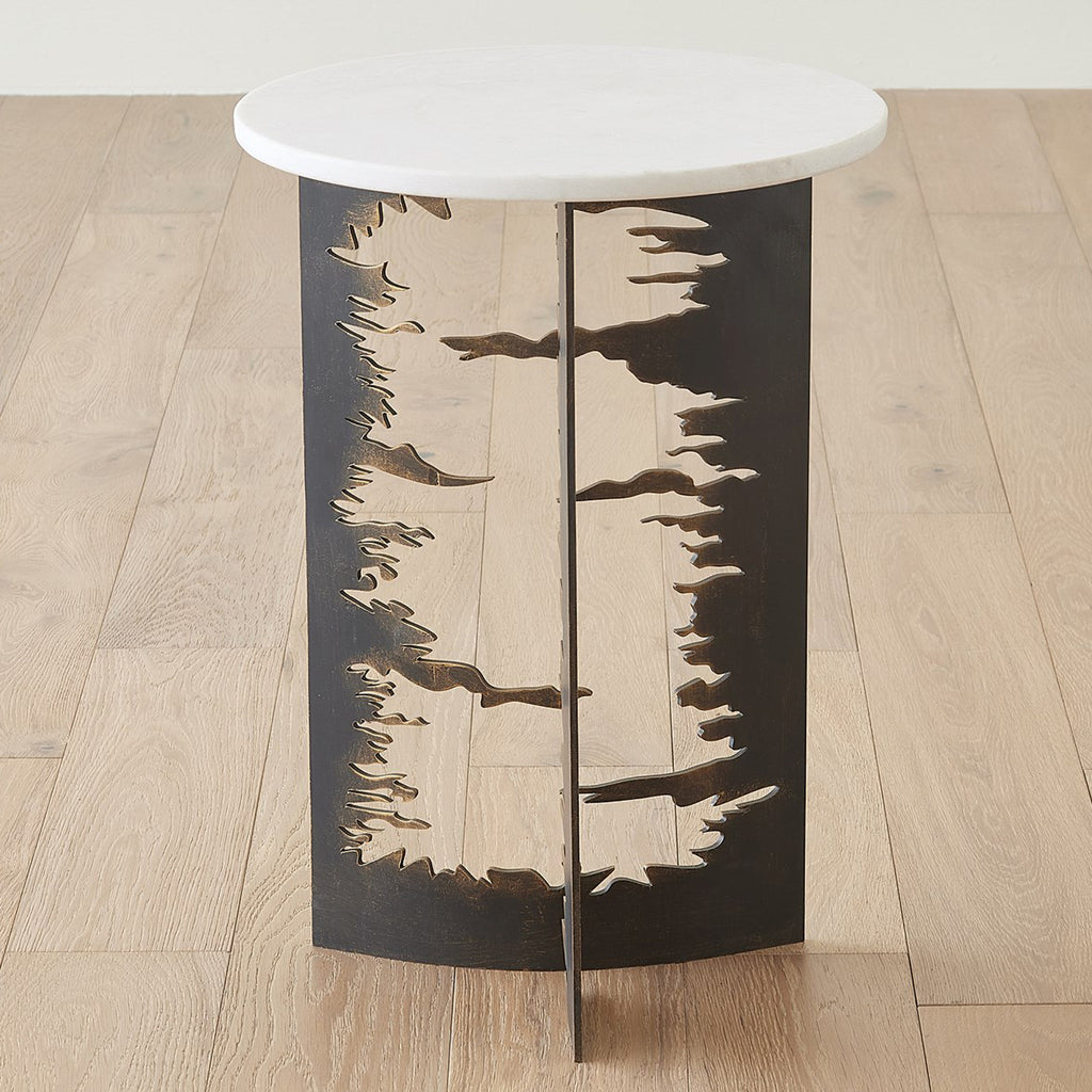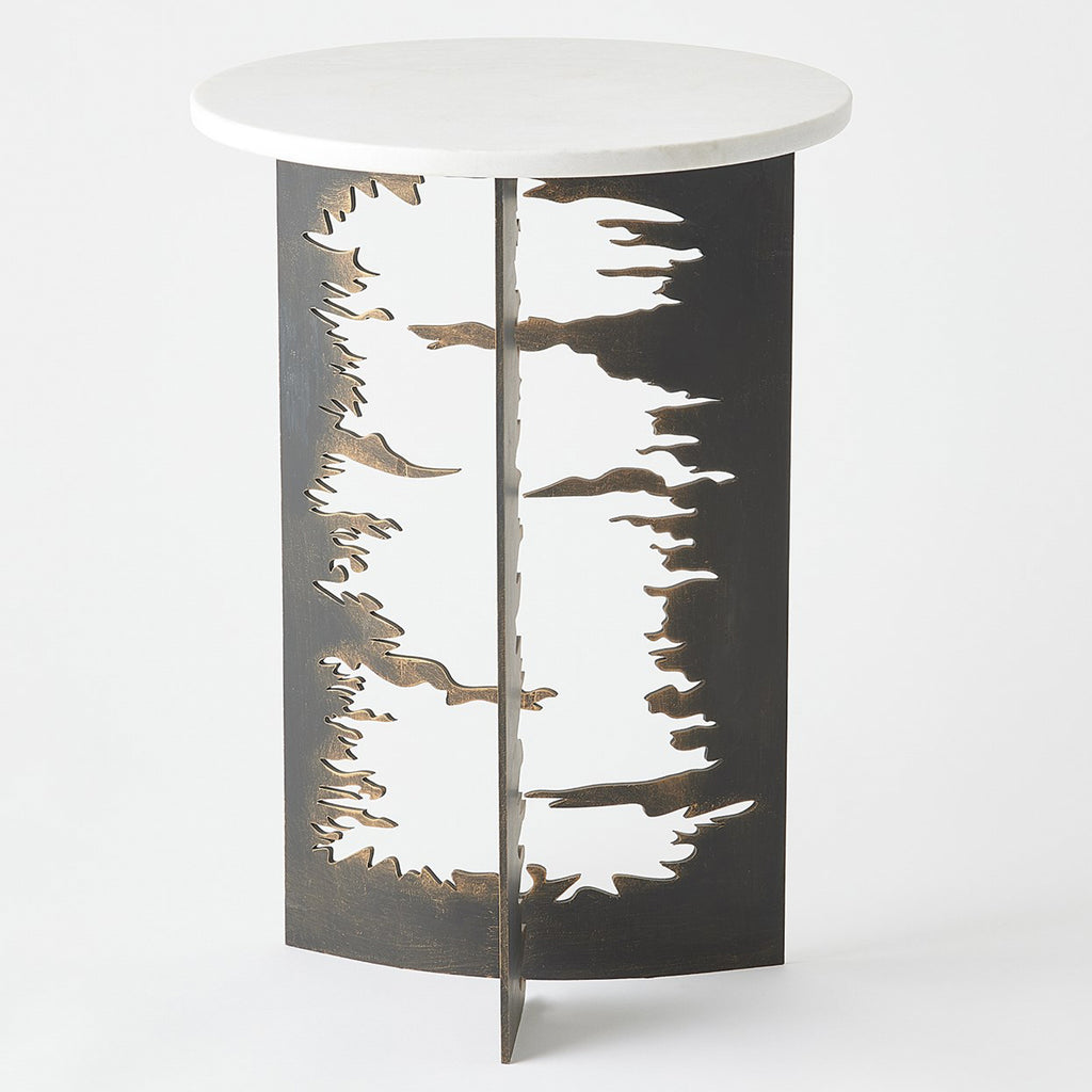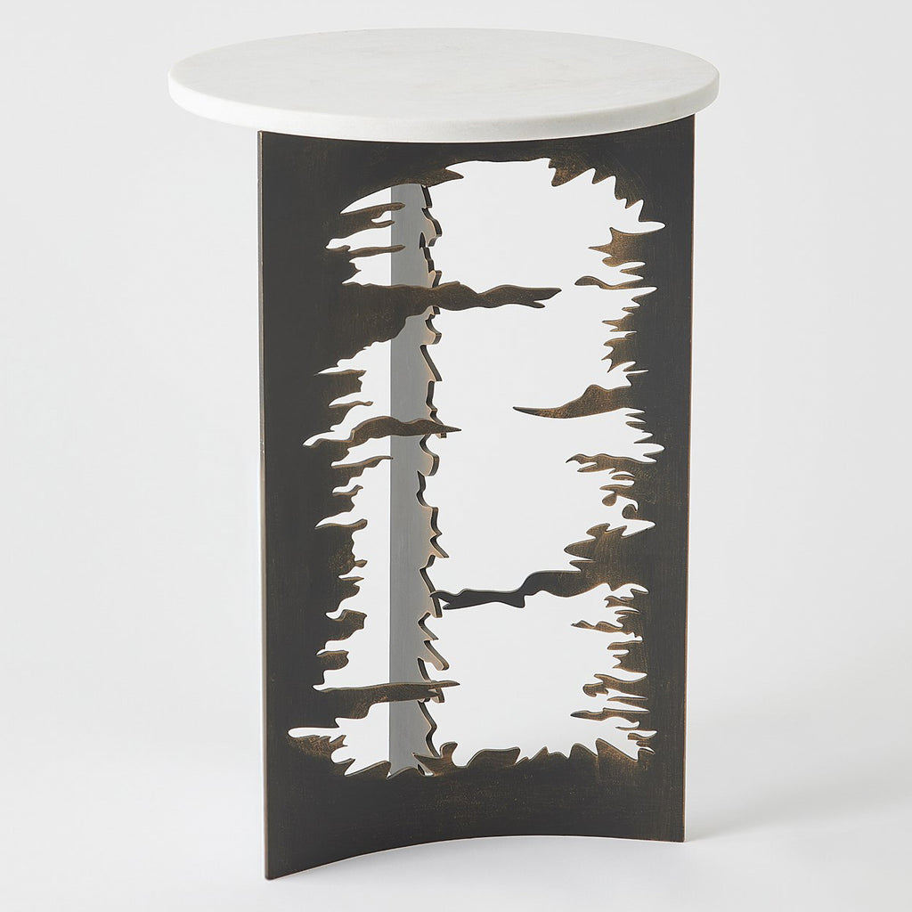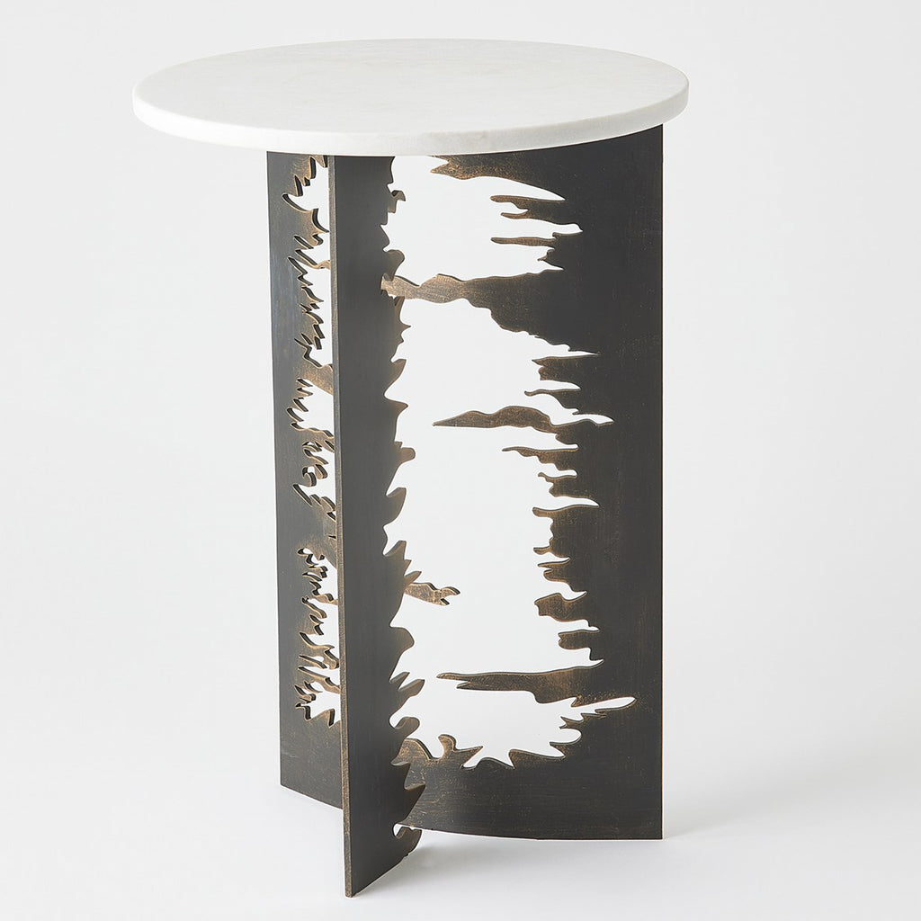 The Cut Out Side Table features an intricate iron pattern created through a precise rolling and laser cutting process that blends beauty with structure. A hand-applied bronze finish enhances its refined silhouette, while a polished white marble surface adds a luxurious finishing touch.