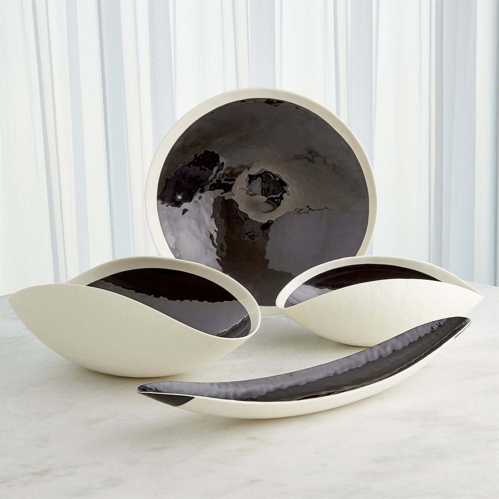 These pieces are handmade glass from the Murano region. This manufacturer invented the centrifuge machine and technique that spins molten glass into discs that are then manipulated by hand into various organic shapes. During the process, varying colors and finishes are applied to the glass. Still, warm pieces are put through an annealing process in a tunnel oven to cool slowly so as not to explode. The annealing process can take anywhere from hrs. to many days depending on the thickness of the glass. Annealing is a process of slowly cooling glass to relieve internal stresses after it was formed. The process may be carried out in a temperature-controlled kiln known as a Lehr. Glass that has not been annealed is liable to crack or shatter when subjected to a relatively small temperature change or mechanical shock. Annealing glass is critical to its durability.