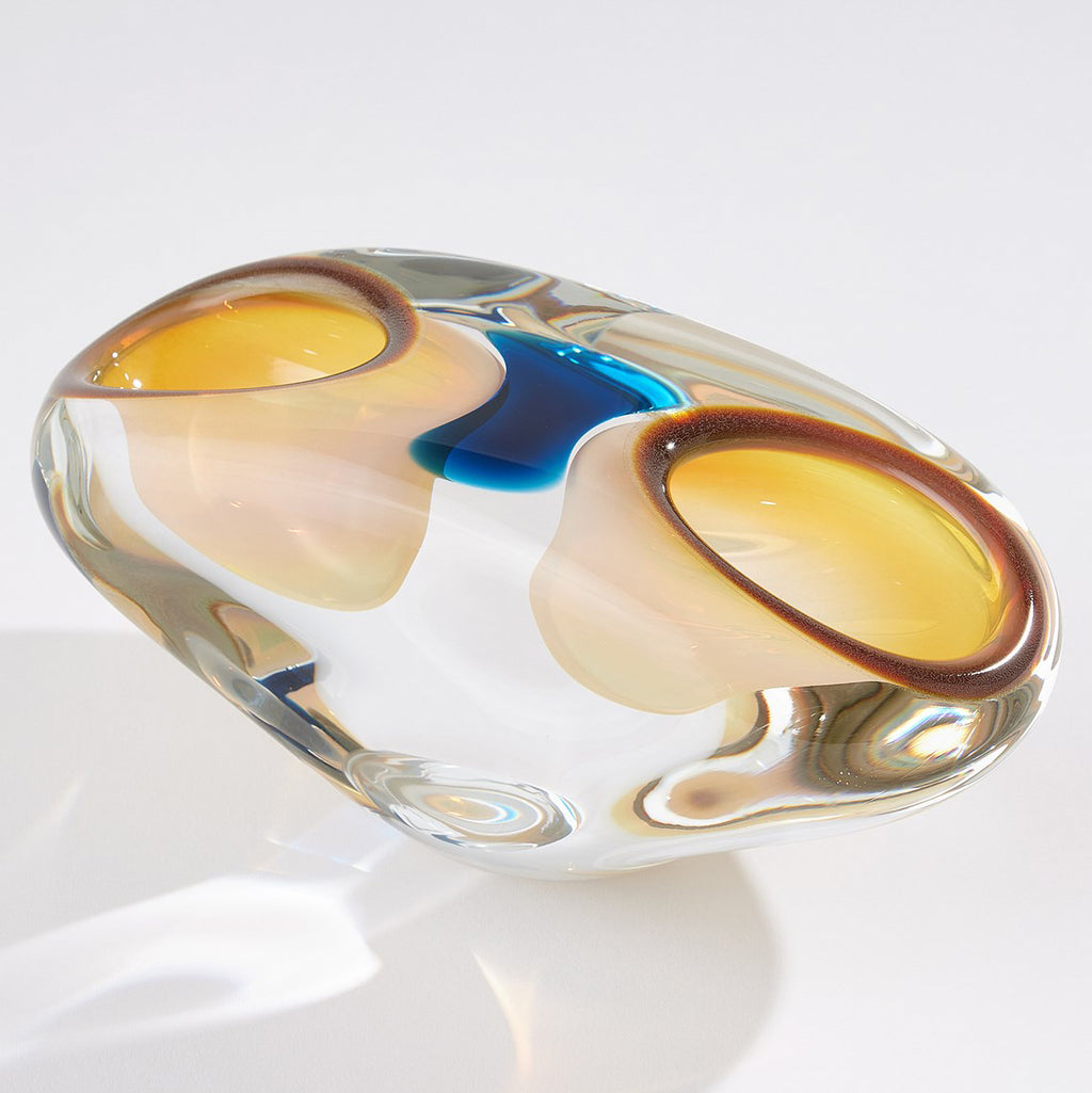 Handcrafted by Polish artisans, the Gemella Vessel features encased layers of amber, blue, and clear glass. The captivating interaction of these rich colors creates a stunning visual effect, ensuring that each piece is a unique, one-of-a-kind work of art.