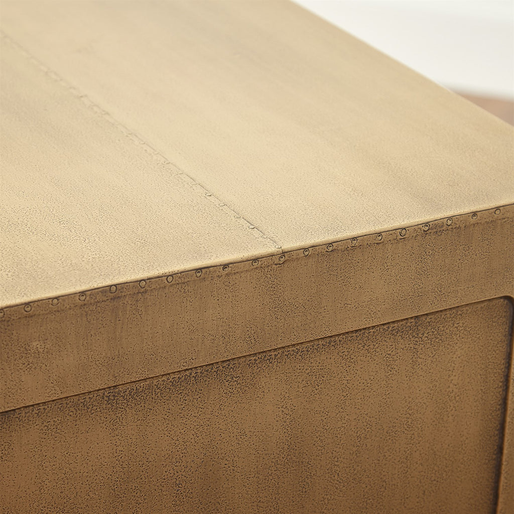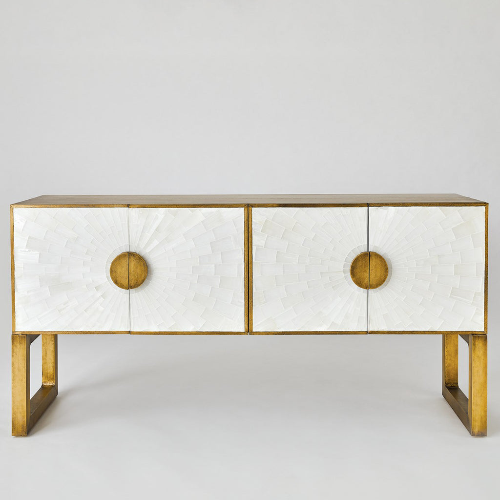 The Gypsum Console's front panels feature an intricate sunburst pattern of selenite crystals, complemented by a sleek brass-covered base and cast aluminum hardware. Inside, adjustable glass shelves, a mirrored back, and smooth European hinges add both functionality and elegance to this striking piece.