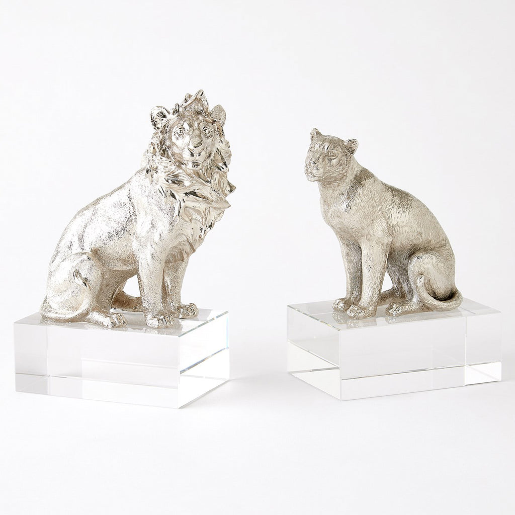 Our stunning Lion & Lioness Sculptures are handcrafted from cast brass with a beautiful nickel finish. Each sculpture is expertly created using the lost wax technique, which involves making a detailed wax model that is melted away to form a precise mold, allowing for high precision and the ability to produce intricate designs. These majestic figures sit elegantly on a luxurious removable crystal base, making them a perfect statement piece for any space.