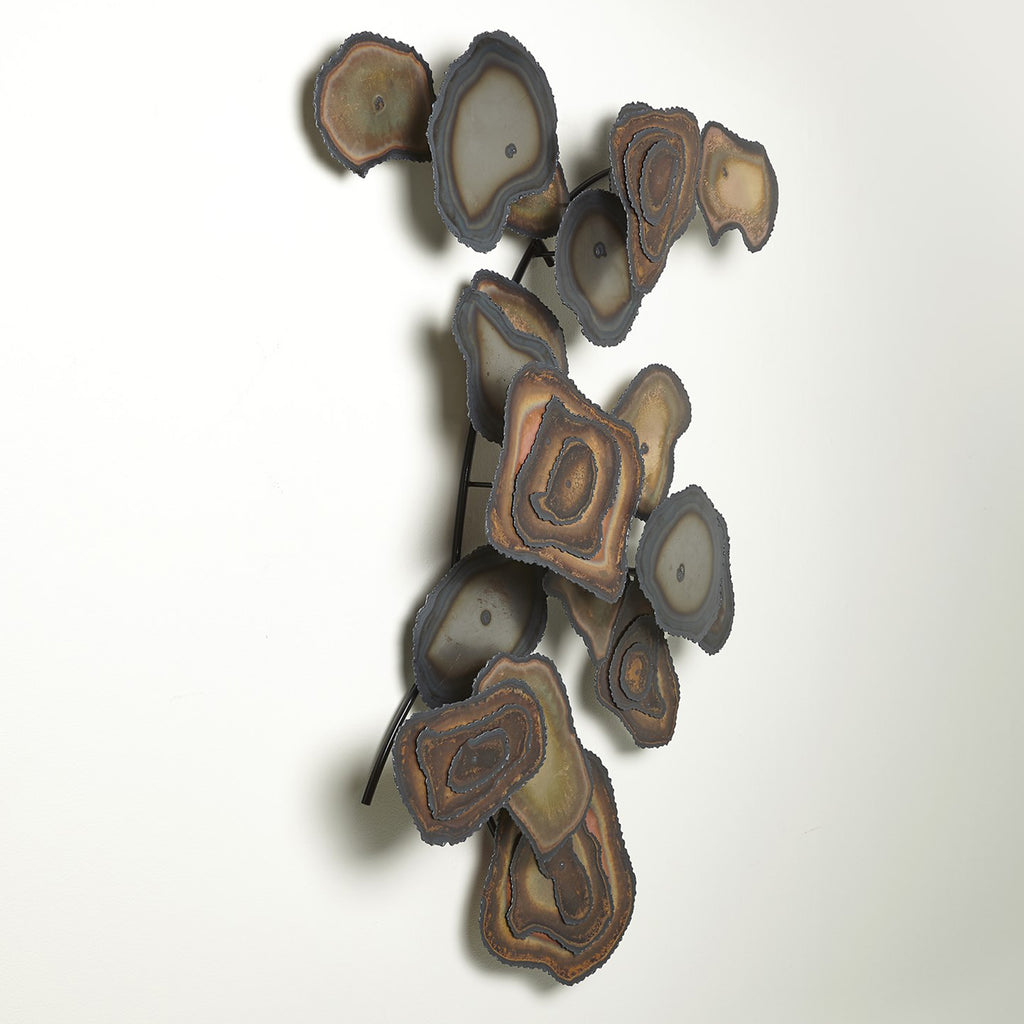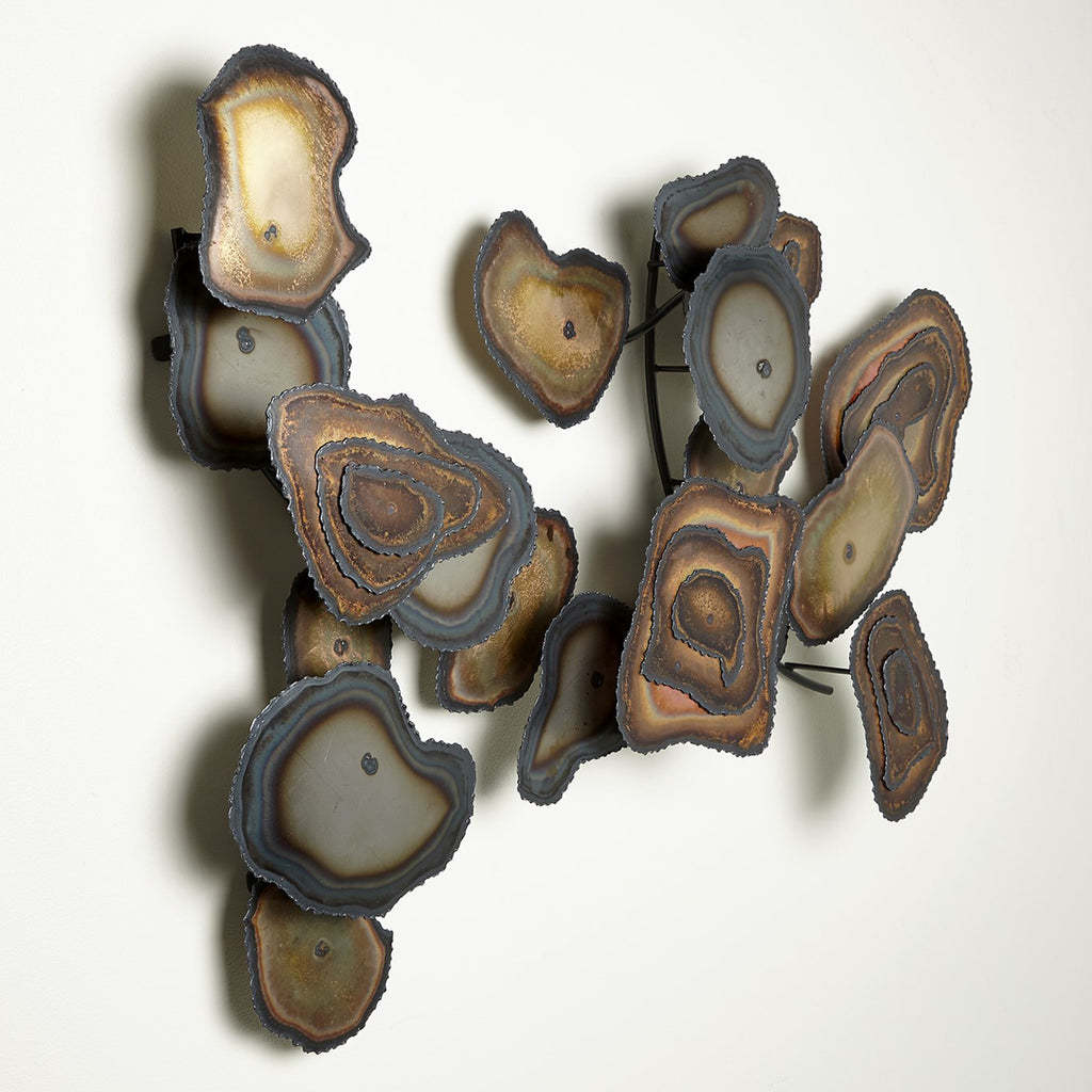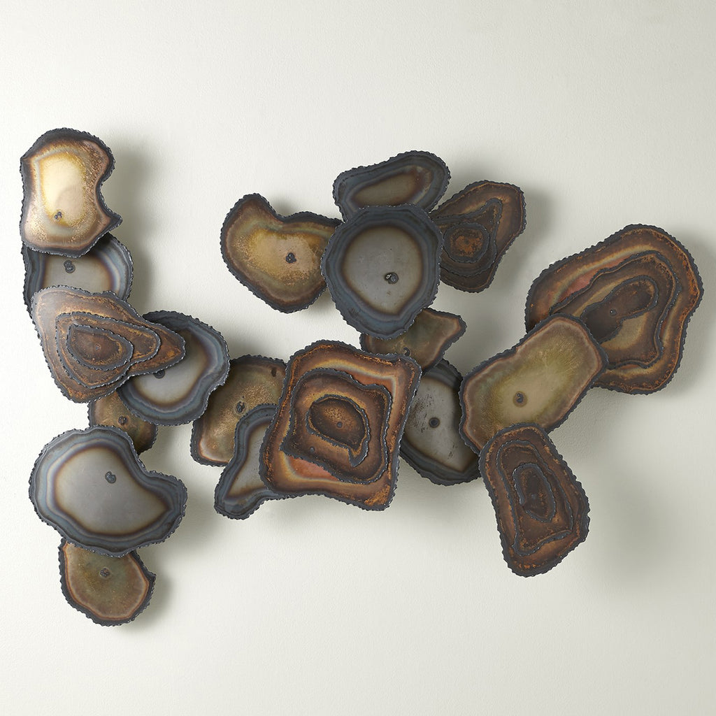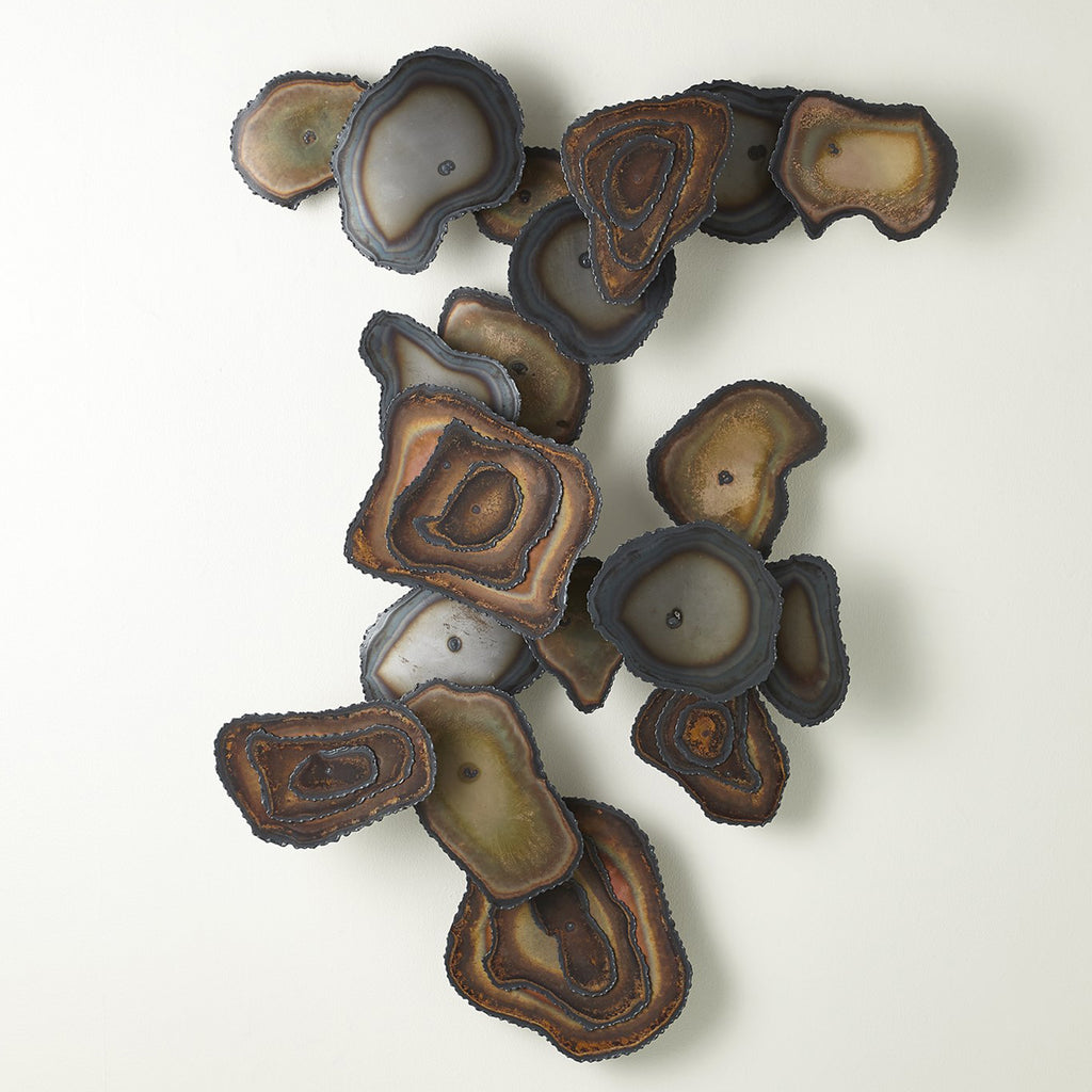 Global Views Mod Terrace Wall Art is cut iron and brass with braised edges and flamed patina. No two pieces are exactly alike.