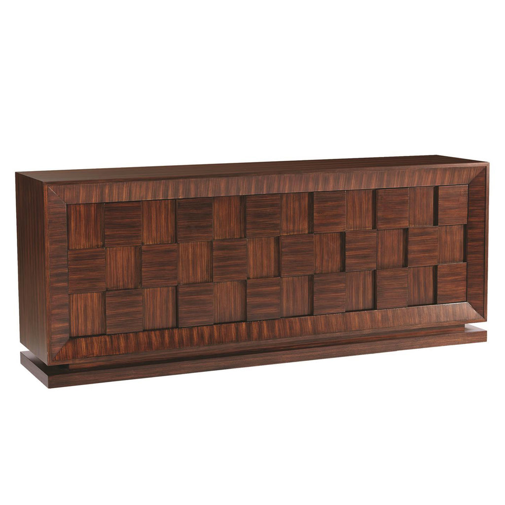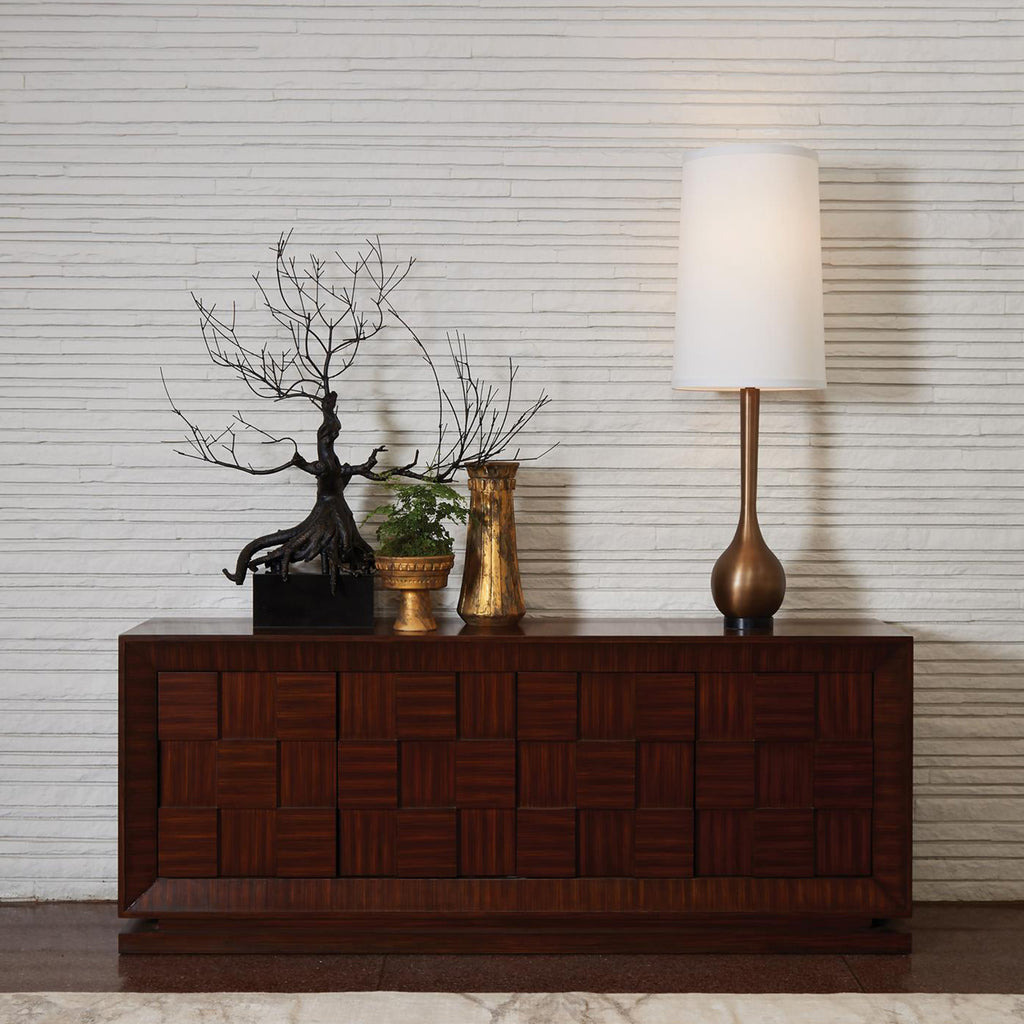 The breathtaking Global Views Quad Block Chest makes an architectural statement with its handsome geometric pattern of zebra wood veneer. Ample in size, it allows you plenty of space to display your stylish glass sculptures or vintage collectables. It has an adjustable shelf behind each door and rear grommets for easy access for component wiring making it not only beautiful but functional.
