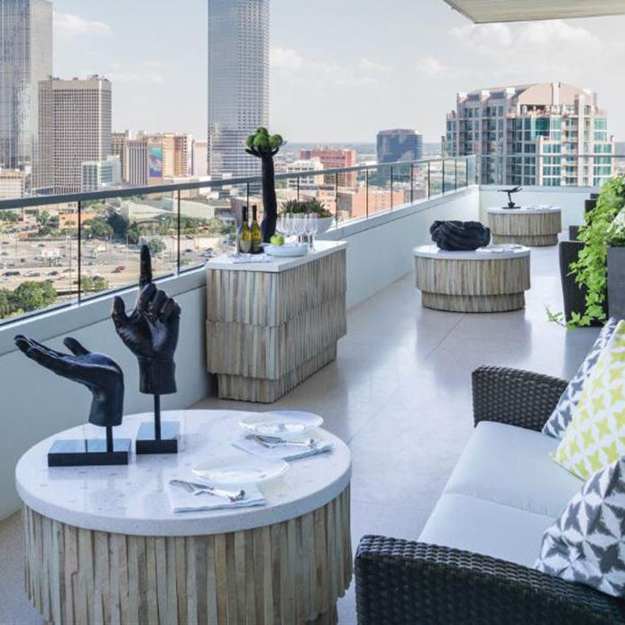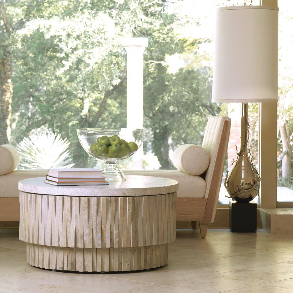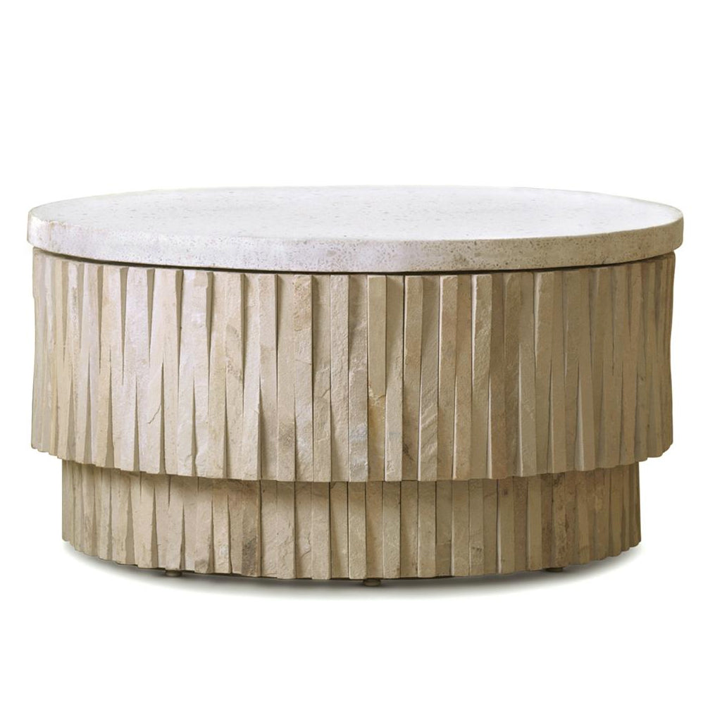 Stone from the desert of Rajasthan is hand chiseled and sculpted by artisans to create the Global Views Round Teeter Totter cocktail table. The sculptural table has a removable terrazzo top and four adjustable nylon glides on the base. The table can be used indoors or outdoors.