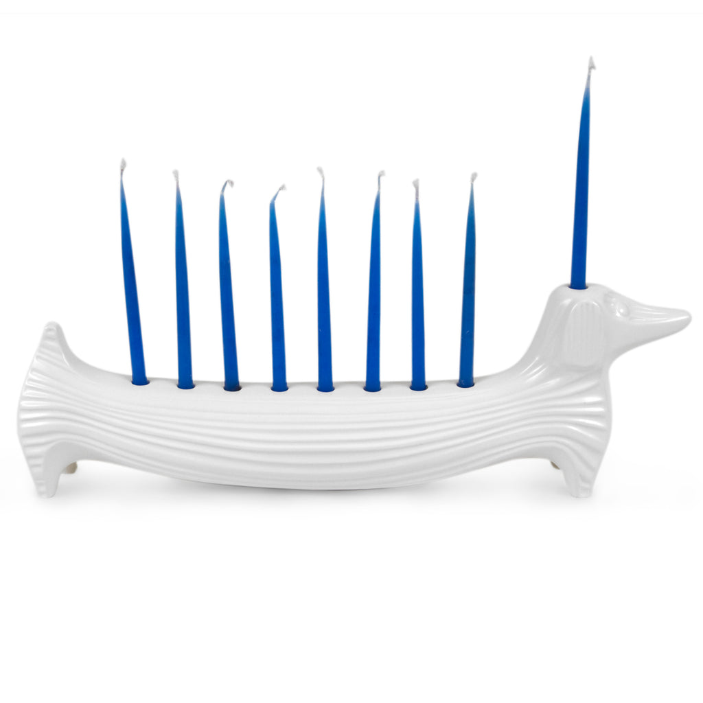 An elemental animal form with subtle layers of pattern and decoration, finished with a soft satin matte glaze. This hot dog starts its journey in our Soho pottery studio where Jonathan and his team sculpt the original model in clay. The prototype is then sent to our workshop in Peru where skilled artisans produce each menorah in high-fired stoneware. Unexpected and original.