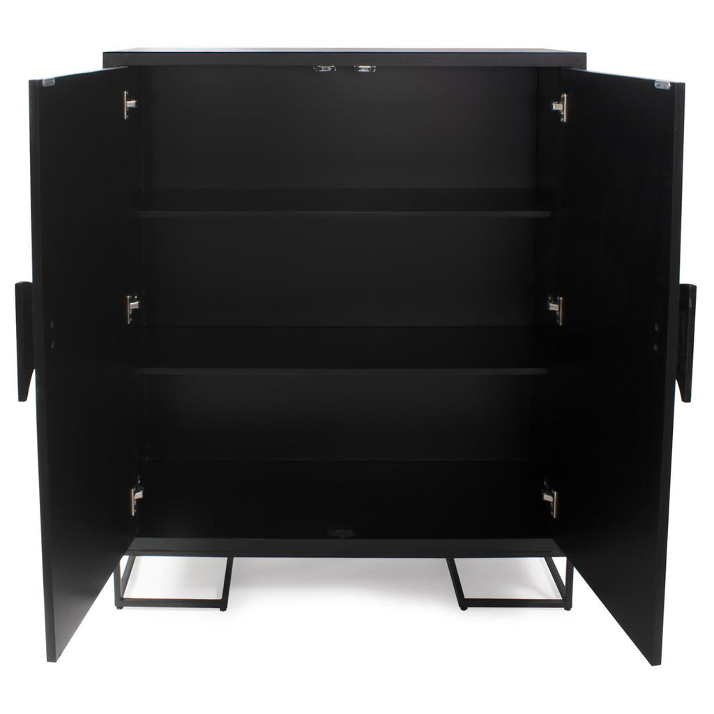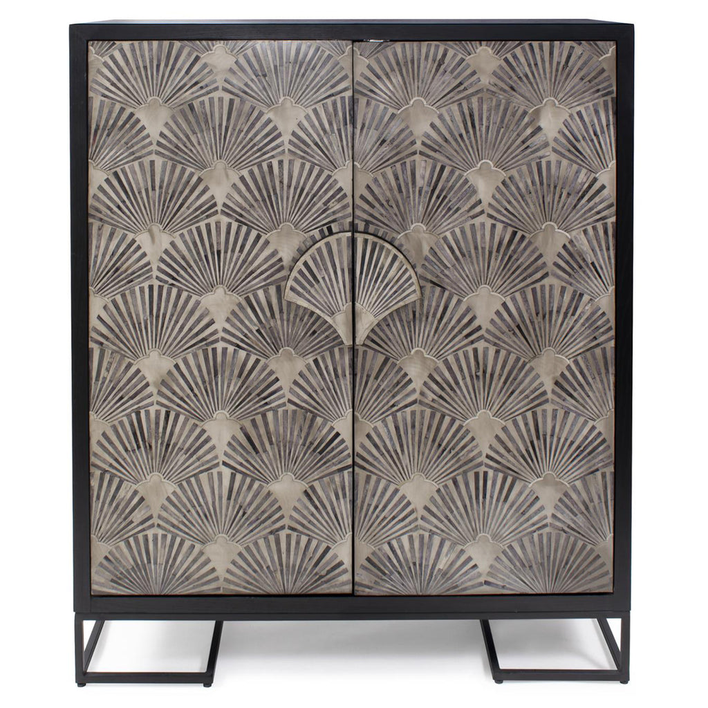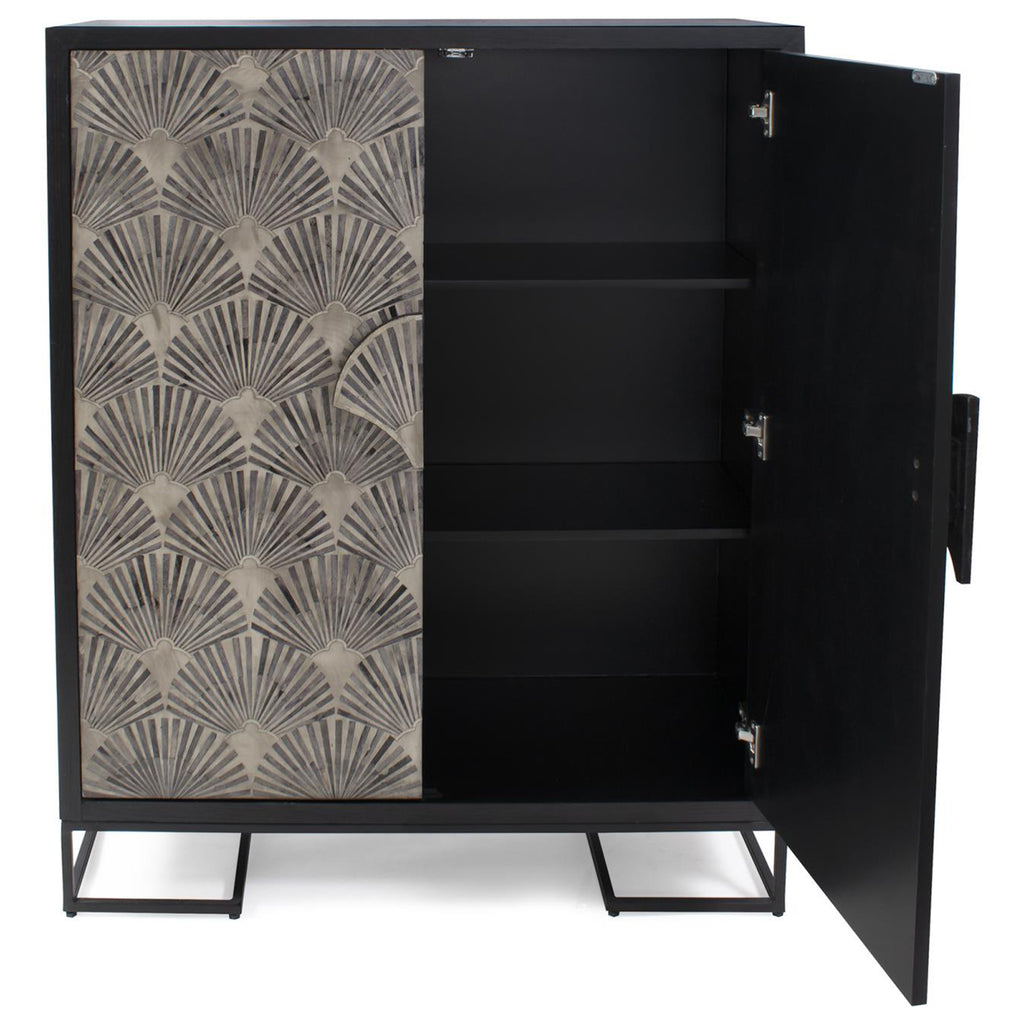 This captivating cabinet showcases a deep black exterior that exudes contemporary sophistication. The front is adorned with meticulously inlaid bone in a fan pattern, creating a striking visual contrast against the dark backdrop. Crafted from mango wood, the cabinet emanates warmth and organic beauty, adding a touch of nature's elegance to the piece. Sitting atop a sturdy iron stand, it balances delicacy and strength. With two spacious shelves, this cabinet offers ample storage and display space, making it as functional as it is visually captivating.