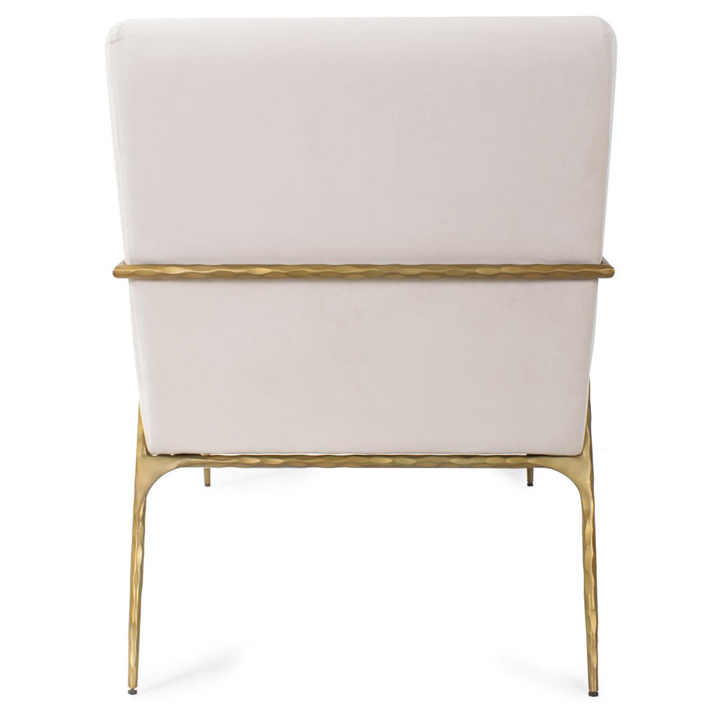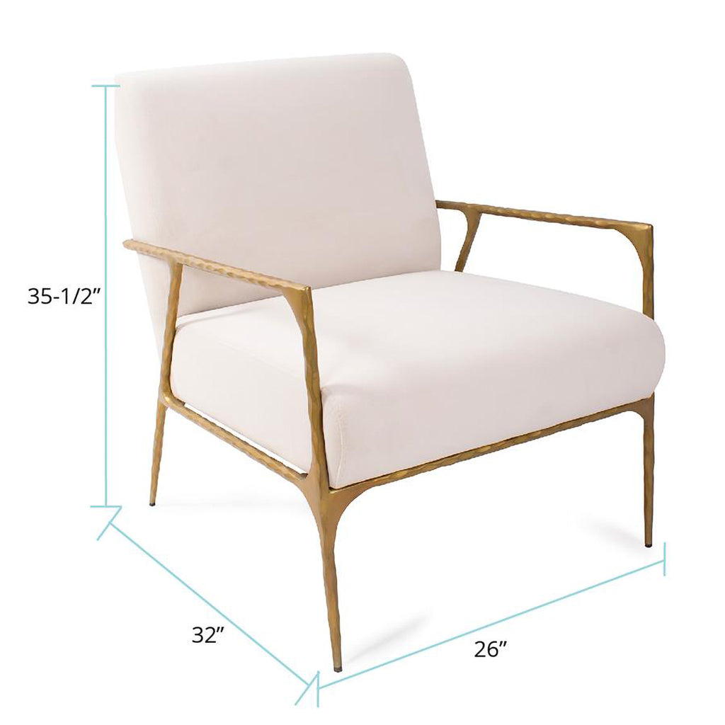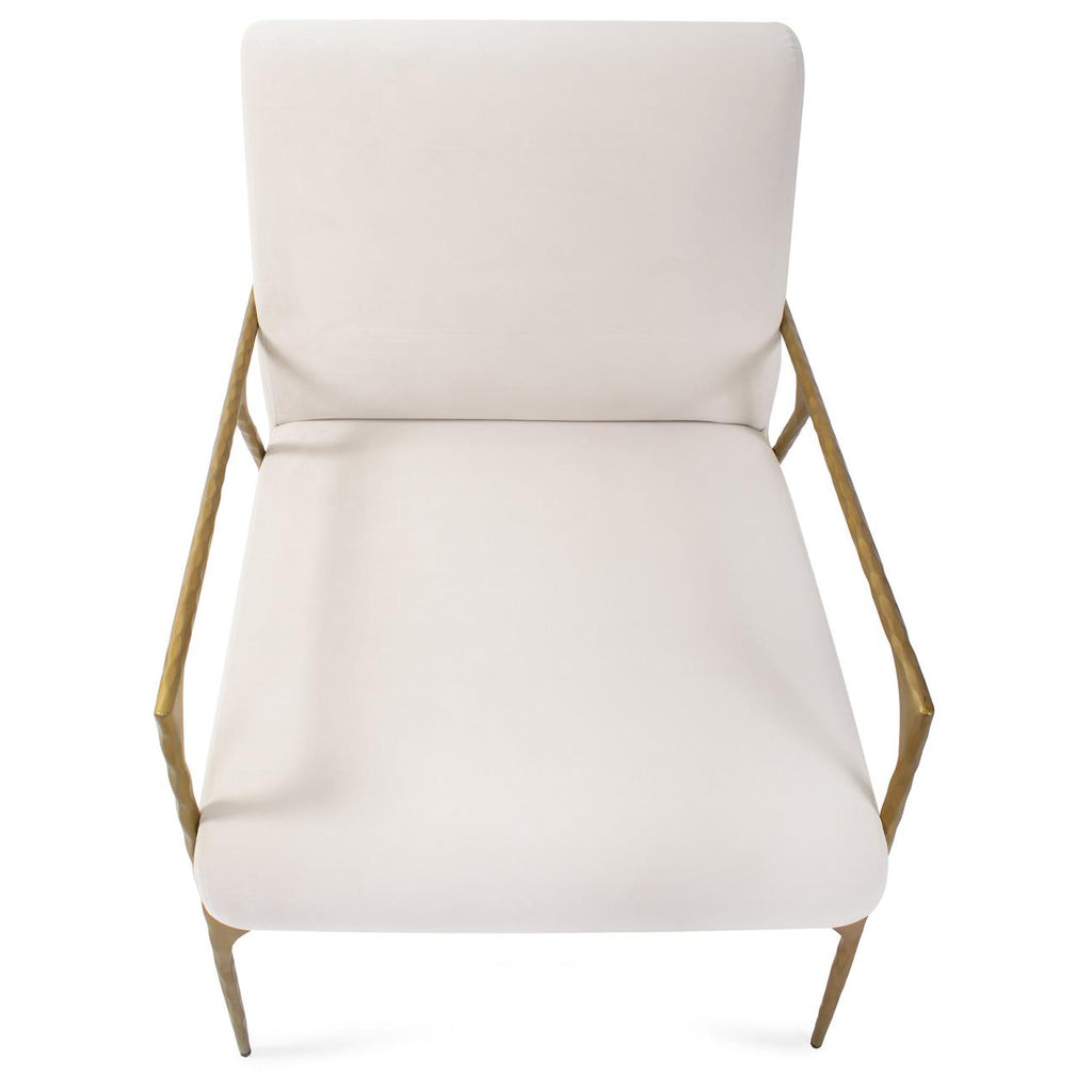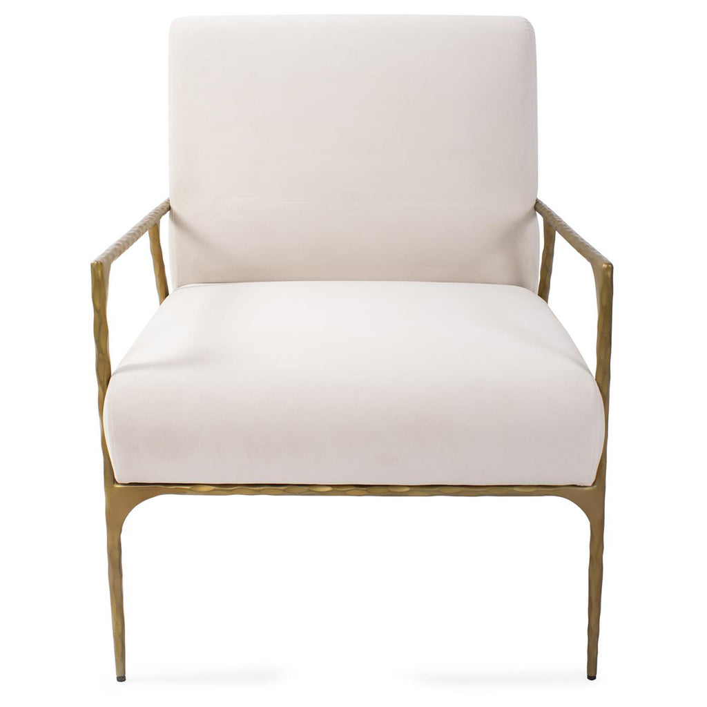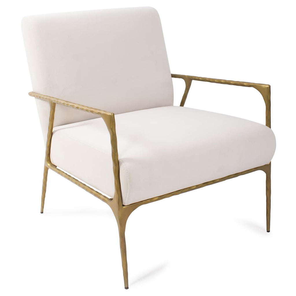 Behold the epitome of luxury and craftsmanship. Its sumptuous cream upholstery offers a soft and inviting seat, creating a perfect blend of comfort and style. The defining feature of this chair lies in its gold iron arms, meticulously wrought with a hammered texture that adds depth and character. Whether gracing a cozy reading nook or commanding attention in a grand sitting room, this armchair is a tribute to the fusion of refined design and unparalleled comfort, promising a seating experience that is as aesthetically pleasing as it is inviting.