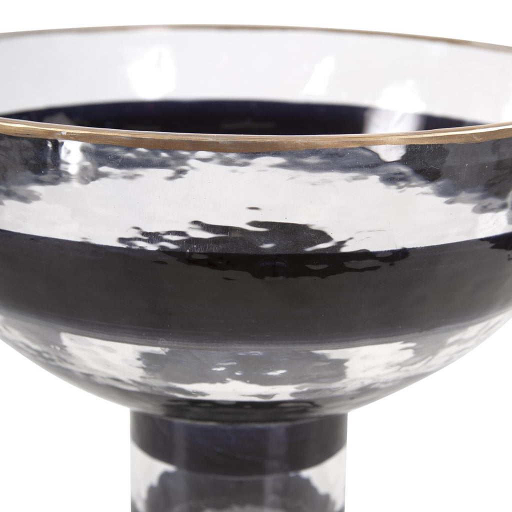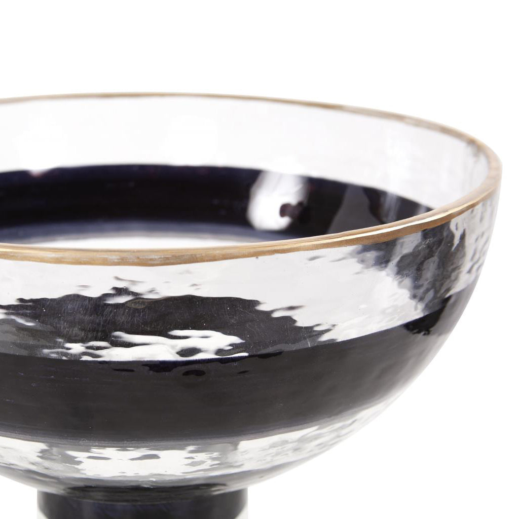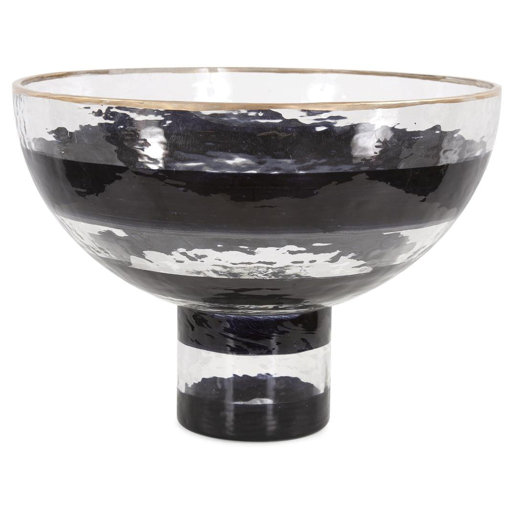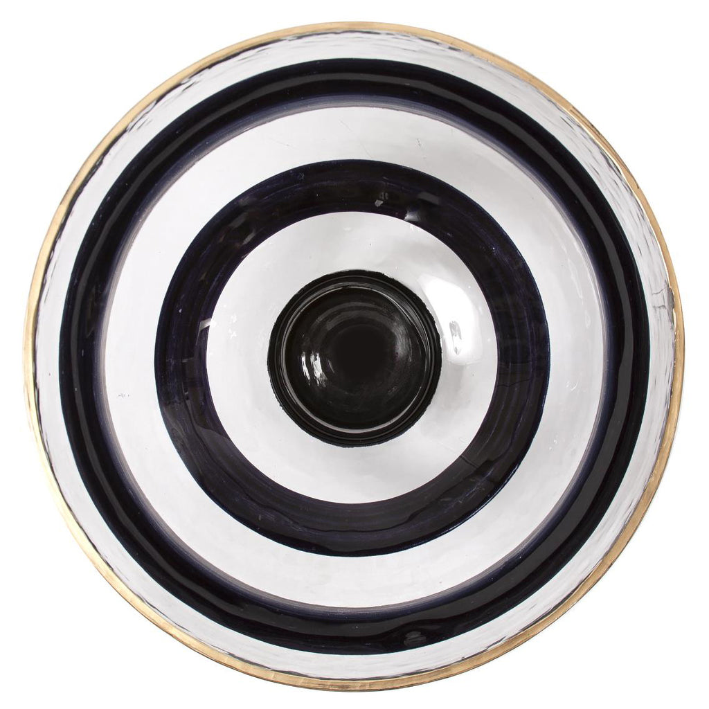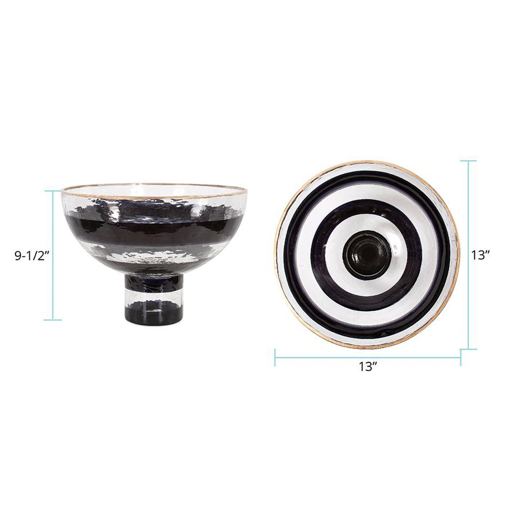 The Vector glass pedestal bowl features a hand painted black swirl pattern and a simple gold touch on the rim to complete the design. This work of art can stand alone or be used to add a touch of drama with some fresh fruit. Function definitely meets style with these two great pieces of glass art.