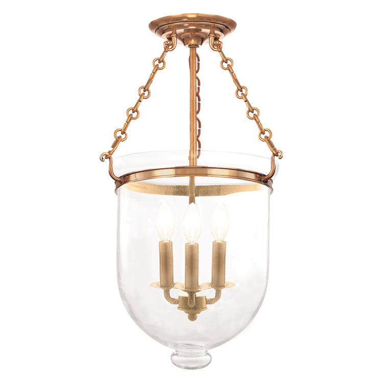In 1887, England declared an imperial holiday to commemorate Queen Victoria’s 50th year on the throne—her “golden jubilee." Public celebrations occurred across the empire. Photographs from India show a distinctive array of glass lanterns illuminating the occasion, representing the hybrid of Anglo and Indian design sensibilities. Hampton reproduces these historic, mouth-blown glass lanterns. While the oversized bell jar originally held a reservoir of whale oil, we suspend a candelabra array to provide warm light without the mess. The upper shade deflected the oil’s thick smoke to prevent it from staining the ceiling. Hampton comes in four metal finishes and three glass options, allowing you to customize the look to your own décor.