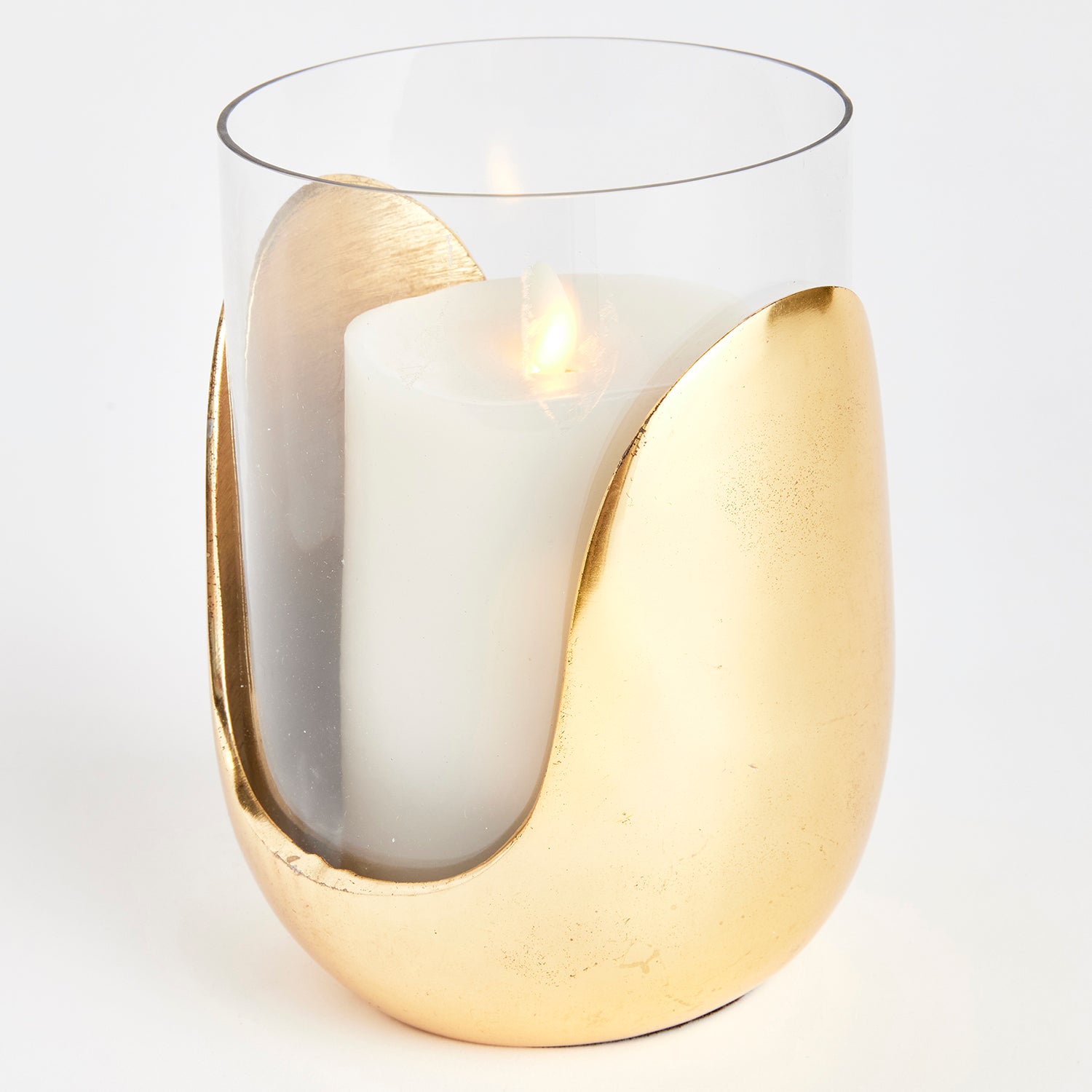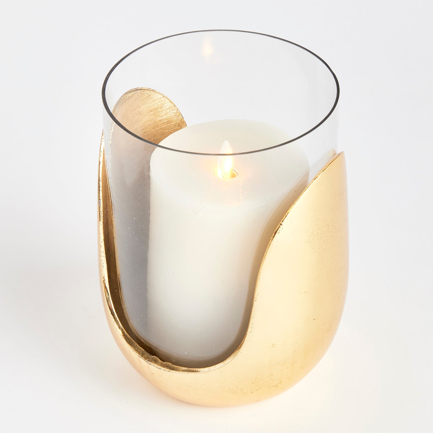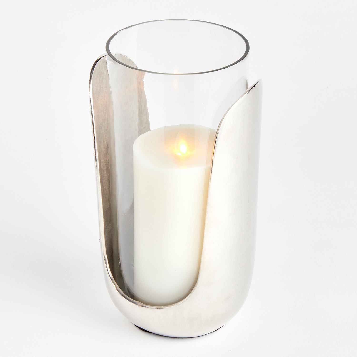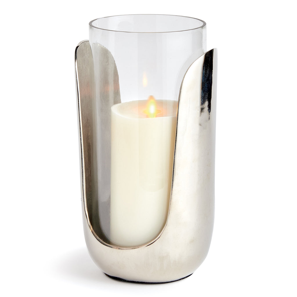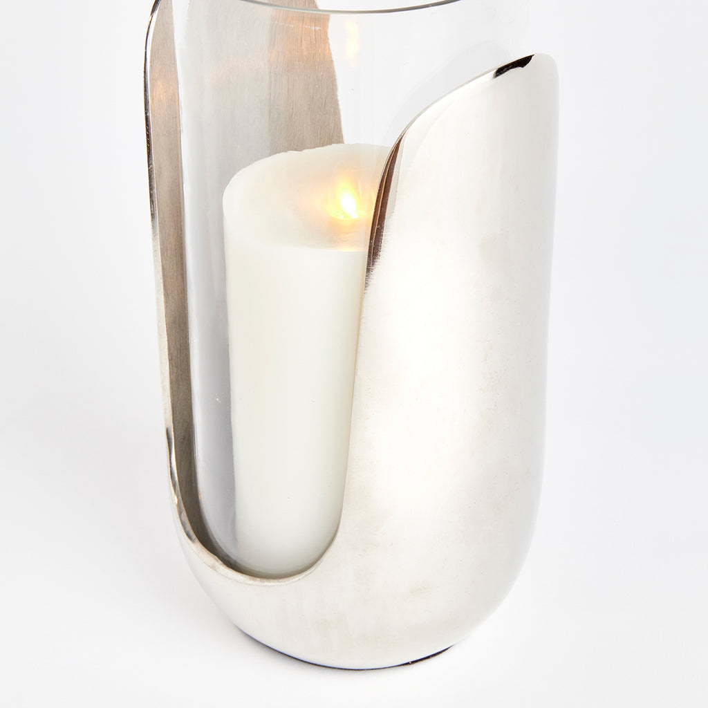 In a marriage of thoughtful design and mixed materials, this stunning hurricane features hand blown glass that slides into a cast aluminum abstract base in a sleek silver. A truly unique contemporary accent for side table, console or mantel.
