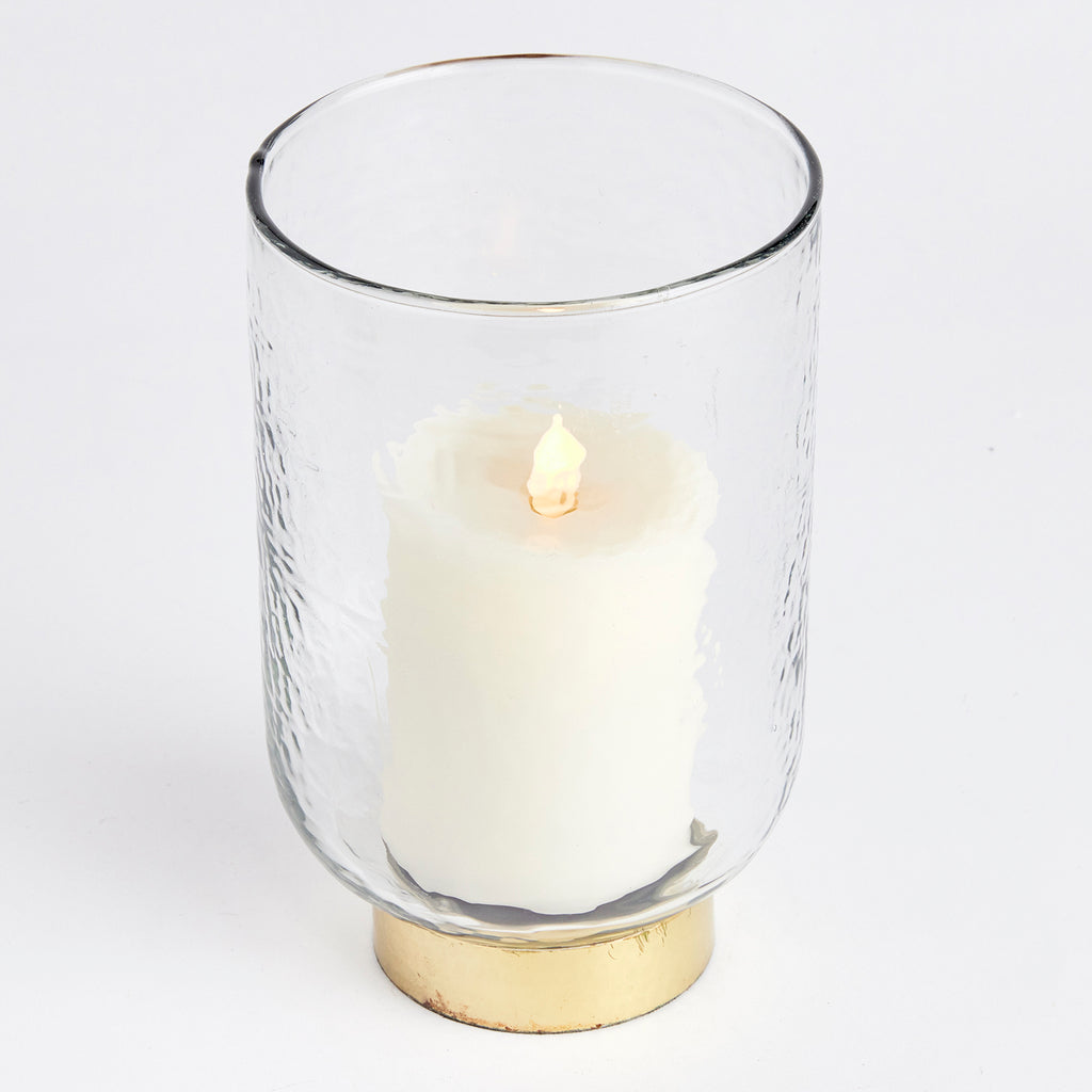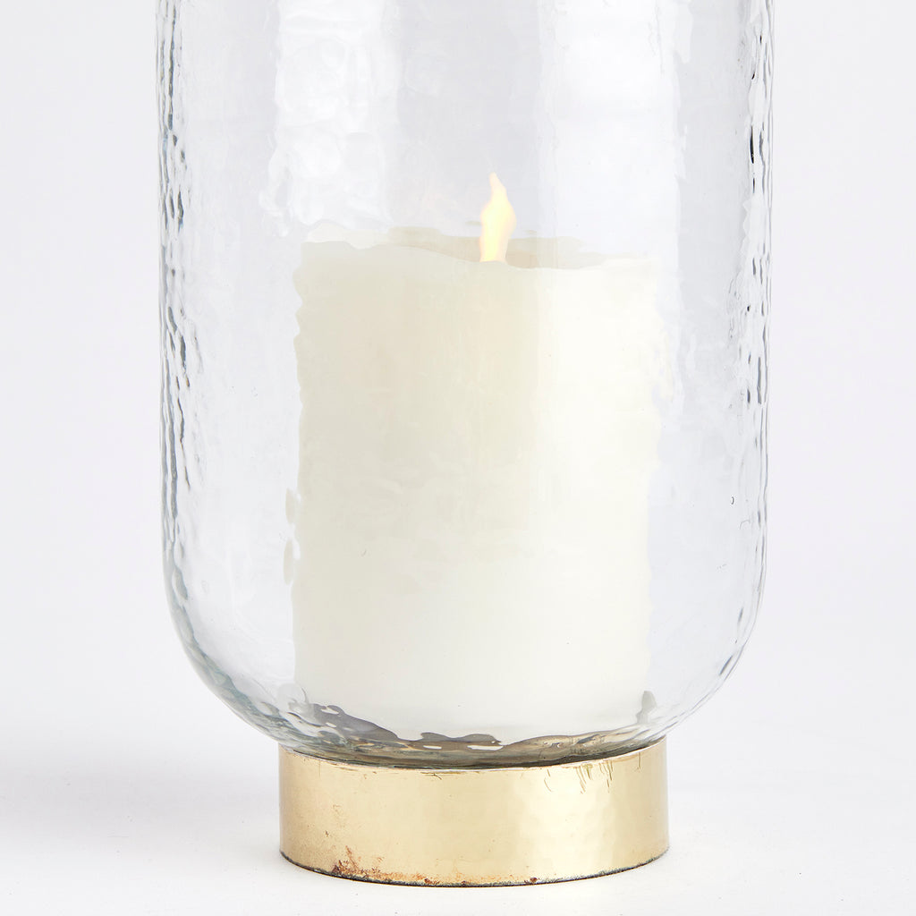 Made of a thick, hammered glass and featuring a melted uneven edge this hurricane has an artisan's touch. Finished off with a hammered gold rim base, an elegant accent for console, bookshelf or mantel.
