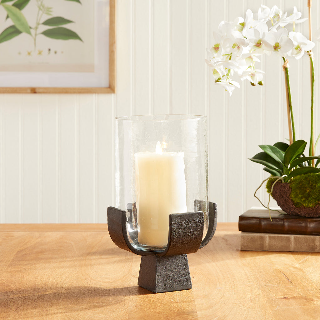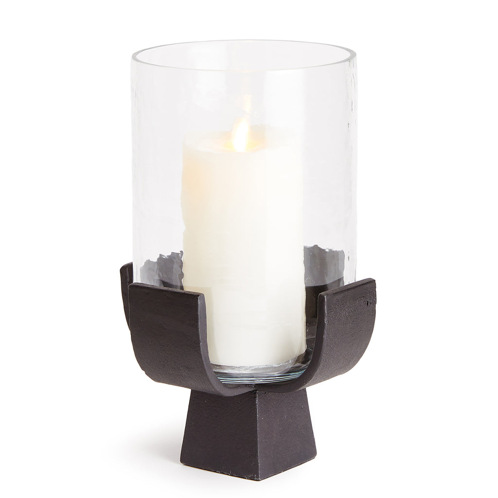 A sturdy bronze modern form cradles a glass cylinder of hammered glass. As sculptural as it is functional. Just add a candle for a warm glow.