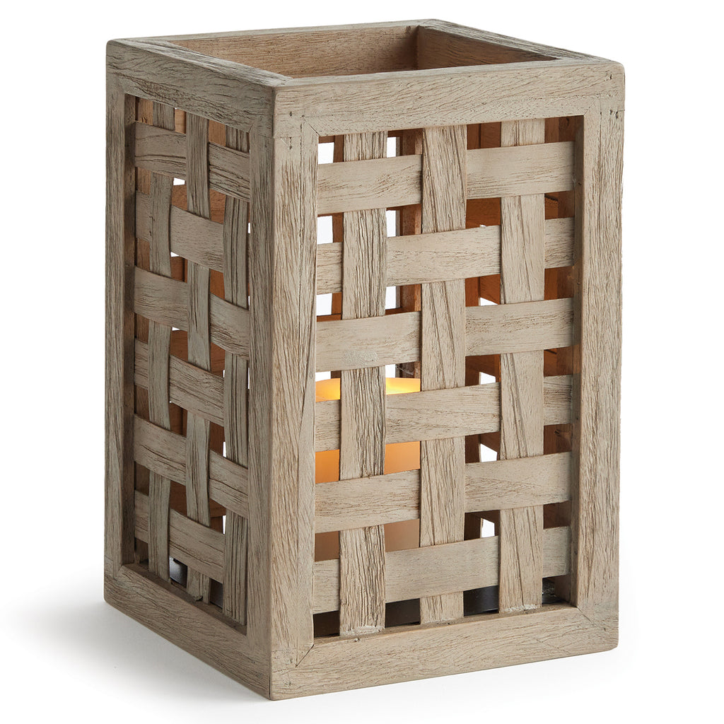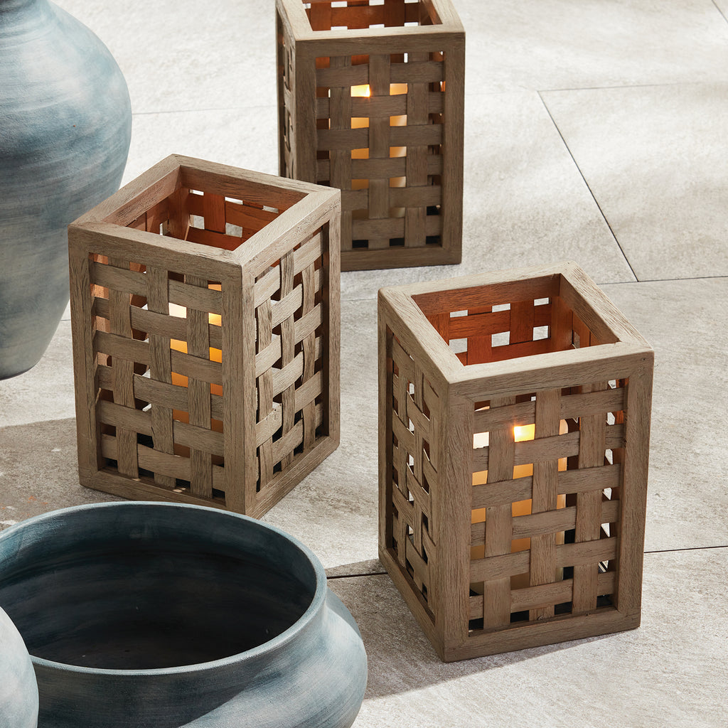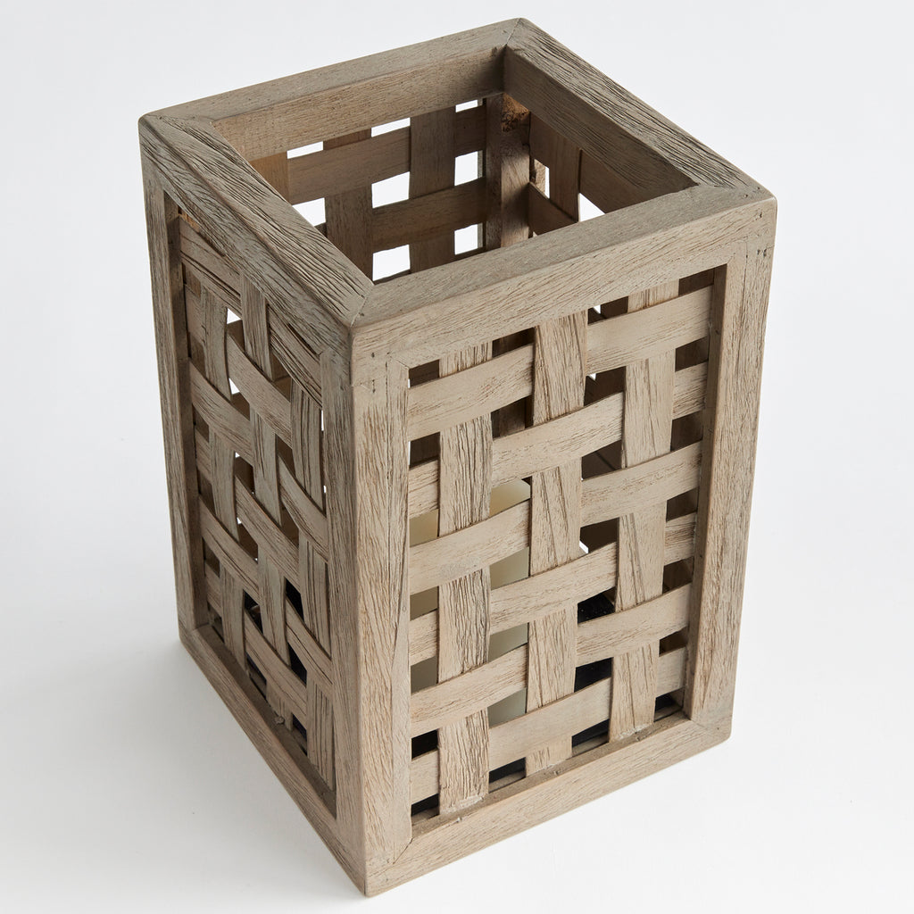 Expertly handwoven using wide gray washed teak wood panels in a check pattern. An exclusive design you won't see anywhere else, this hurricane makes an exquisite centerpiece for the dinner table, mantle or console.