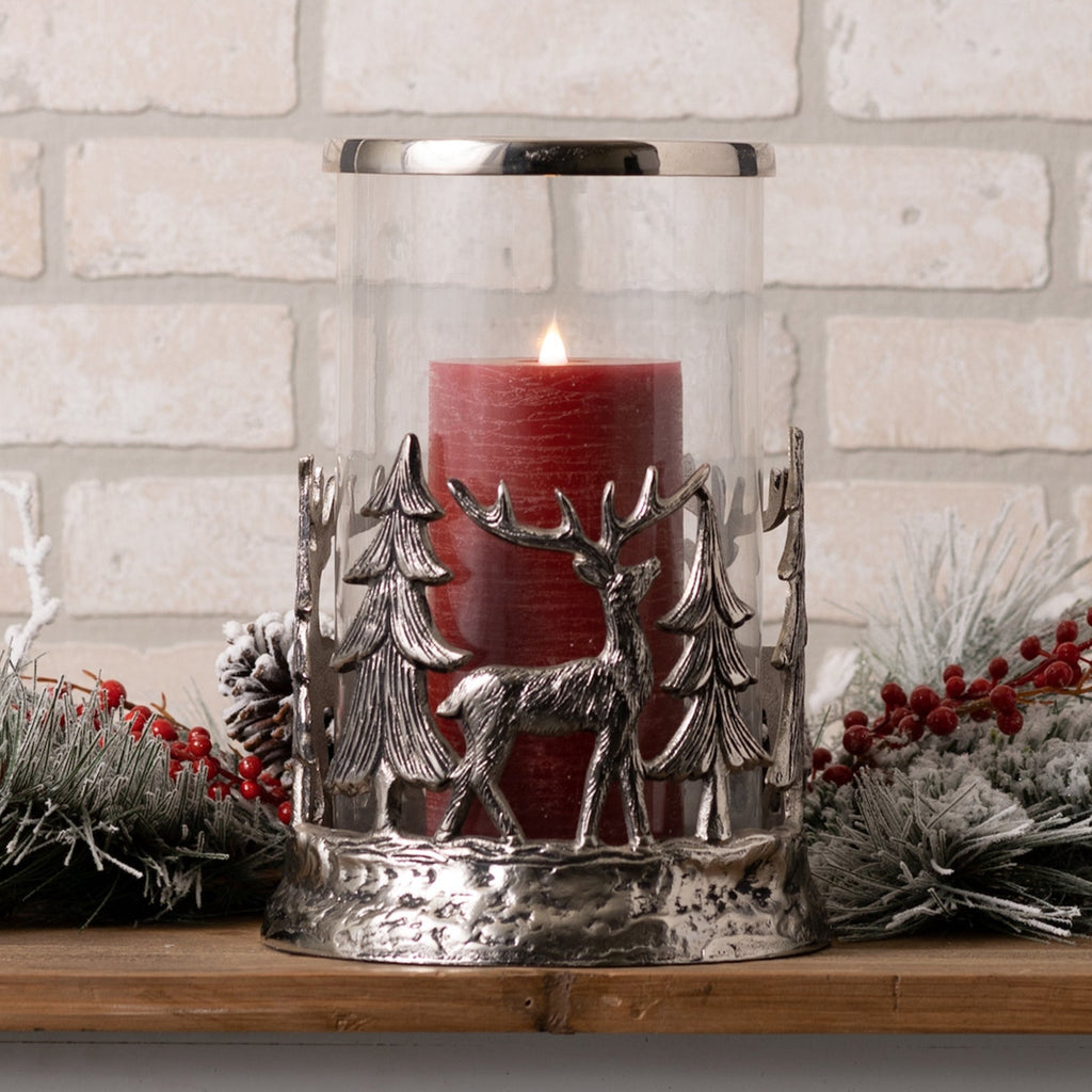 Add a touch of woodland style to your home with this Etched Metal Candle Holder. Measuring 11in tall, this piece is a great fit for your rustic or cabin lodge style of holiday decor. The etched metal design paired with the woodland deer and pine tree scene is the perfect combination to create a memorable holiday display. The quality glass and aluminum metal composition is sure to endure for seasons to come. Illuminate the display by adding a real wax or LED candle to the holder. Candles sold separately, this piece best fits a 4in or 5in pillar candle.